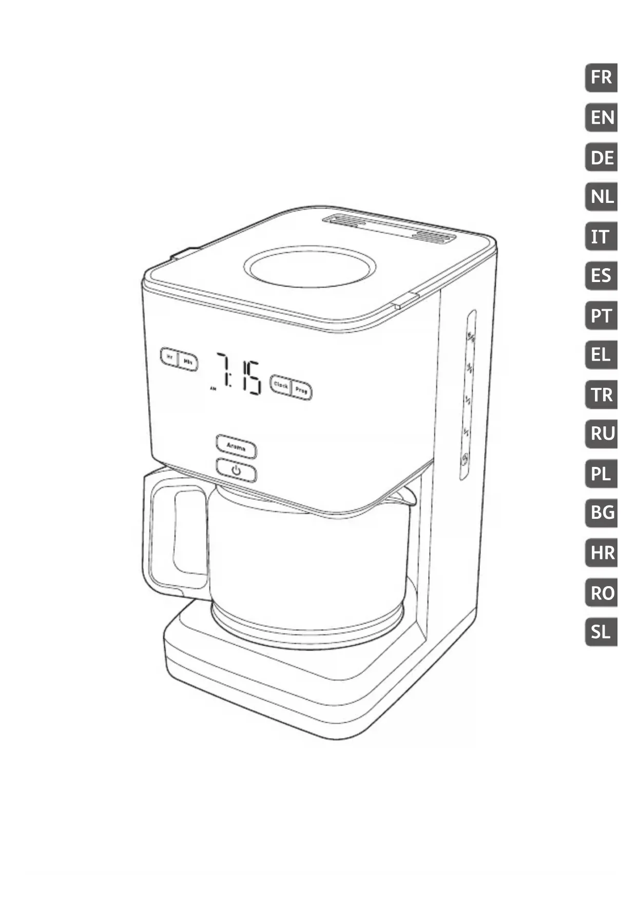 A Corps de l’appareil B Couvercle C Réservoir d’eau D Indicateur de niveau d’eau E Couvercle de la carafe F Poignée de la carafe G Carafe H Plaque chauffante I Porte-filtre J Bouton ON/OFF K Bouton PROG L Bouton HR M Bouton MIN N Bouton AROMA O Bouton CLOCK P Cuillère