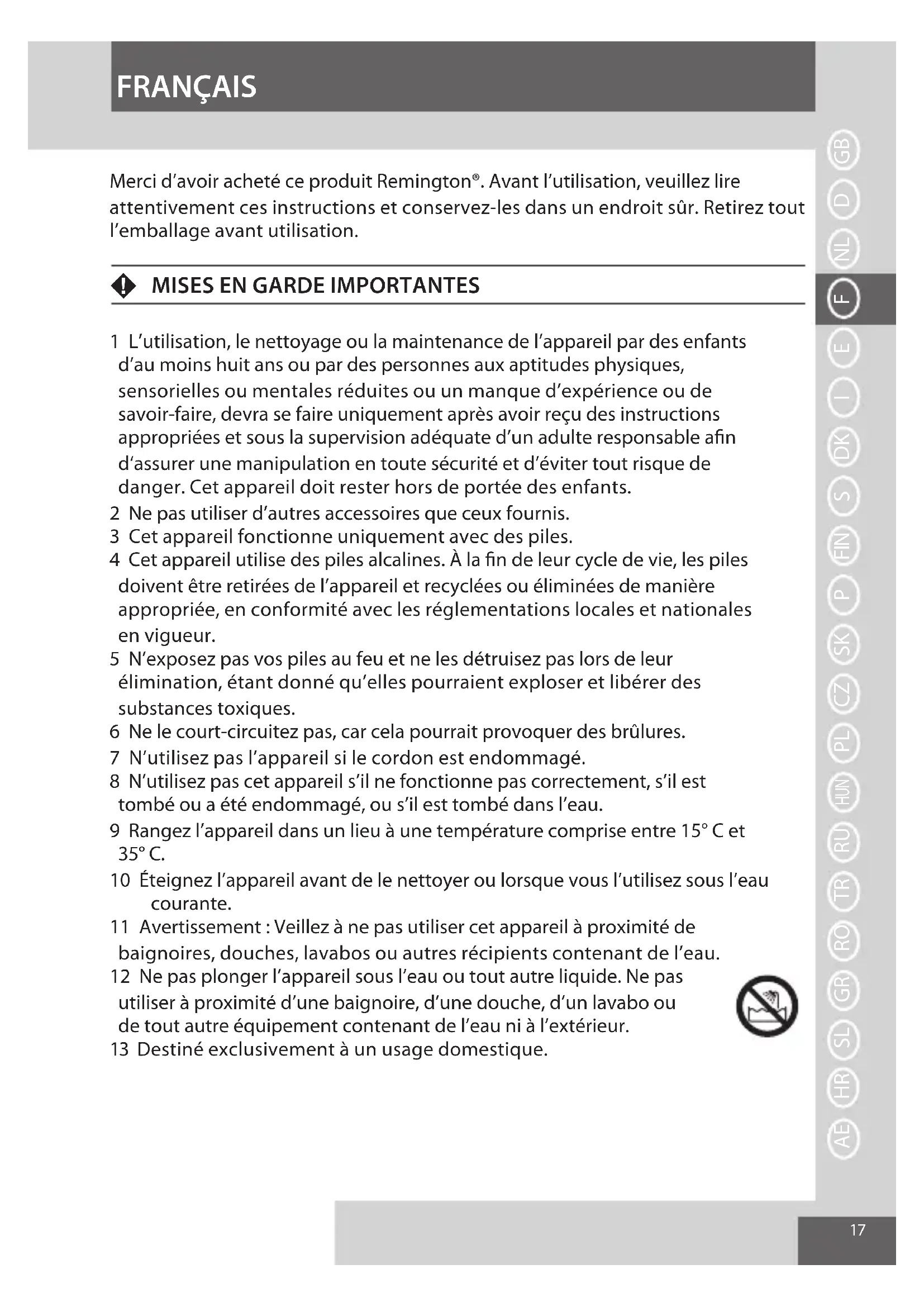 1 L’utilisation, le nettoyage ou la maintenance de l’appareil par des enfants d’au moins huit ans ou par des personnes aux aptitudes physiques, sensorielles ou mentales réduites ou un manque d’expérience ou de savoir-faire, devra se faire uniquement après avoir reçu des instructions appropriées et sous la supervision adéquate d’un adulte responsable an d‘assurer une manipulation en toute sécurité et d’éviter tout risque de danger. Cet appareil doit rester hors de portée des enfants. 2 Ne pas utiliser d’autres accessoires que ceux fournis. 3 Cet appareil fonctionne uniquement avec des piles. 4 Cet appareil utilise des piles alcalines. À la n de leur cycle de vie, les piles doivent être retirées de l’appareil et recyclées ou éliminées de manière appropriée, en conformité avec les réglementations locales et nationales en vigueur. 5 N’exposez pas vos piles au feu et ne les détruisez pas lors de leur élimination, étant donné qu’elles pourraient exploser et libérer des substances toxiques. 6 Ne le court-circuitez pas, car cela pourrait provoquer des brûlures. 7 N’utilisez pas l’appareil si le cordon est endommagé. 8 N’utilisez pas cet appareil s’il ne fonctionne pas correctement, s’il est tombé ou a été endommagé, ou s’il est tombé dans l’eau. 9 Rangez l’appareil dans un lieu à une température comprise entre 15° C et 35° C. 10 Éteignez l’appareil avant de le nettoyer ou lorsque vous l’utilisez sous l’eau courante. 11 Avertissement : Veillez à ne pas utiliser cet appareil à proximité de baignoires, douches, lavabos ou autres récipients contenant de l’eau. 12 Ne pas plonger l’appareil sous l’eau ou tout autre liquide. Ne pas utiliser à proximité d’une baignoire, d’une douche, d’un lavabo ou de tout autre équipement contenant de l’eau ni à l’extérieur. 13 Destiné exclusivement à un usage domestique. GBDNLFEIDKSFINPSKCZ HUN PLRUTRROGRSLAE