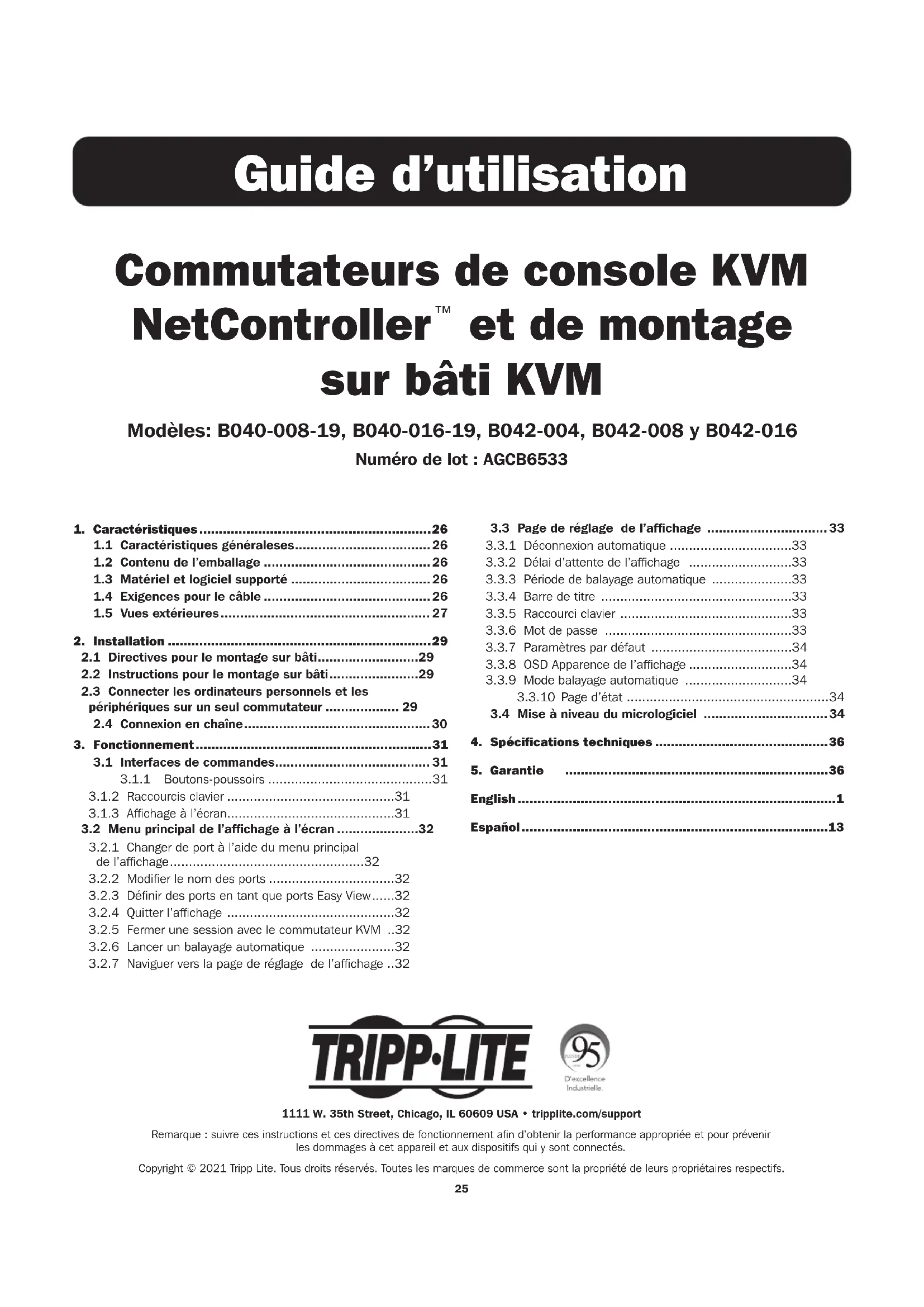 et de montage sur bâti KVM Modèles: B040-008-19, B040-016-19, B042-004, B042-008 y B042-016 Numéro de lot : AGCB6533 1111 W. 35th Street, Chicago, IL 60609 USA • tripplite.com/support Remarque : suivre ces instructions et ces directives de fonctionnement afin d’obtenir la performance appropriée et pour prévenir les dommages à cet appareil et aux dispositifs qui y sont connectés. Copyright © 2021 Tripp Lite. Tous droits réservés. Toutes les marques de commerce sont la propriété de leurs propriétaires respectifs.