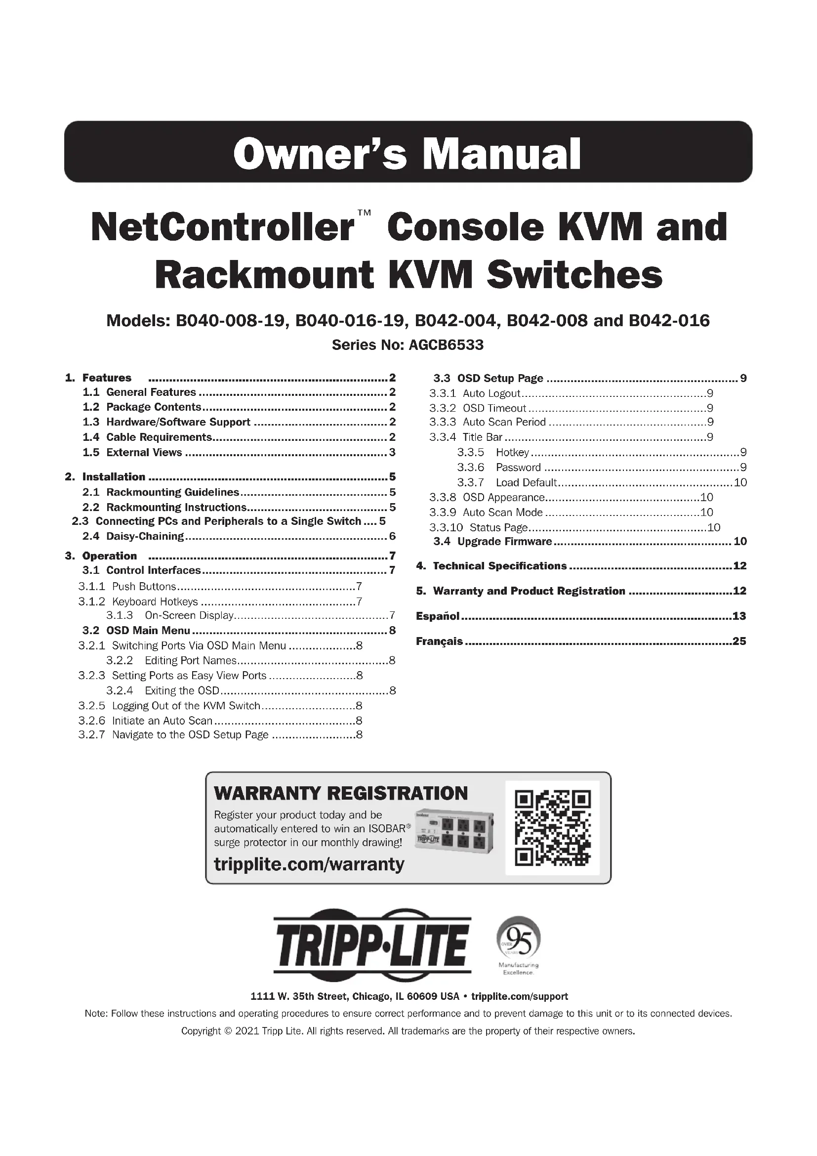 et de montage sur bâti KVM Modèles: B040-008-19, B040-016-19, B042-004, B042-008 y B042-016 Numéro de lot : AGCB6533 1111 W. 35th Street, Chicago, IL 60609 USA • tripplite.com/support Remarque : suivre ces instructions et ces directives de fonctionnement afin d’obtenir la performance appropriée et pour prévenir les dommages à cet appareil et aux dispositifs qui y sont connectés. Copyright © 2021 Tripp Lite. Tous droits réservés. Toutes les marques de commerce sont la propriété de leurs propriétaires respectifs.