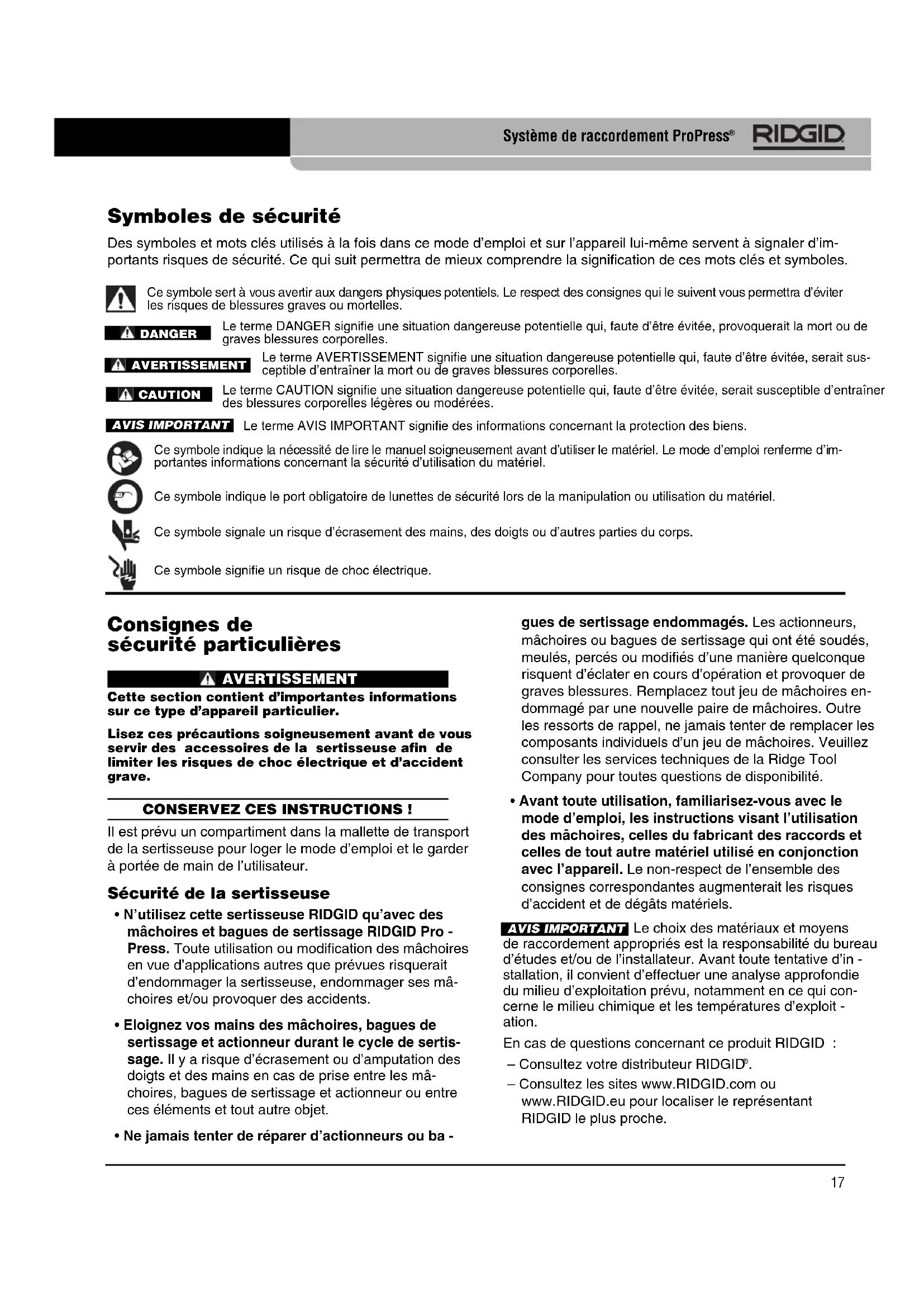 - N’utilisez cette sertisseuse RIDGID qu’avec des mâchoires et bagues de sertissage RIDGID Pro - Press. Toute utilisation ou modification des mâchoires en vue d’applications autres que prévues risquerait d’endommager la sertisseuse, endommager ses mâ- choires et/ou provoquer des accidents.