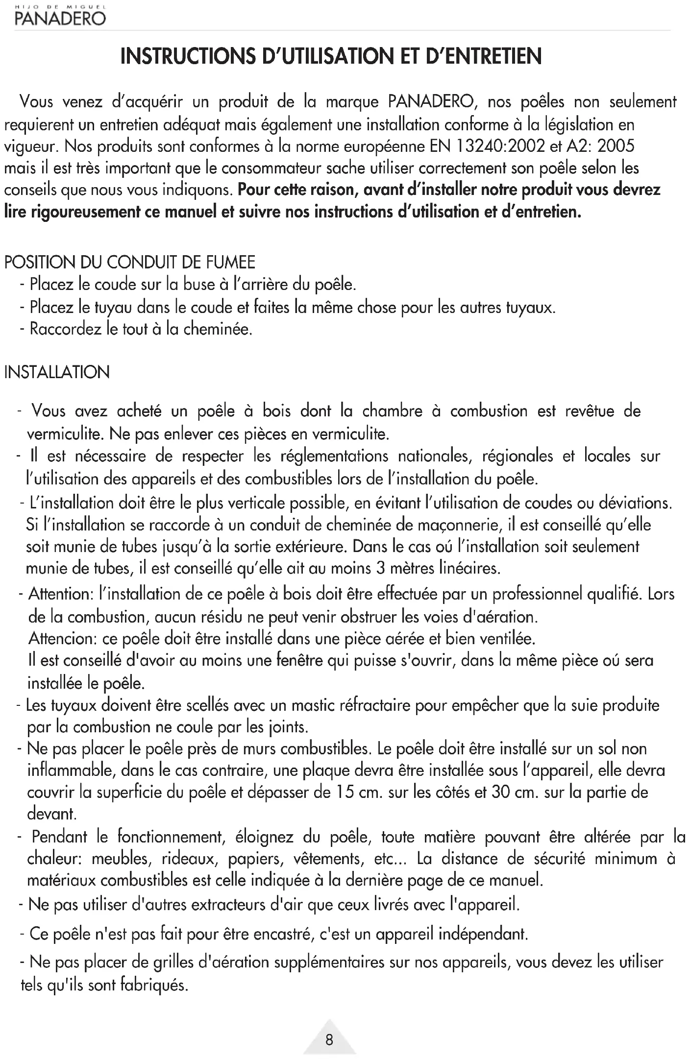 Vous venez d’acquérir un produit de la marque PANADERO, nos poêles non seulement requierent un entretien adéquat mais également une installation conforme à la législation en vigueur. Nos produits sont conformes à la norme européenne EN 13240:2002 et A2: 2005 mais il est très important que le consommateur sache utiliser correctement son poêle selon les conseils que nous vous indiquons. Pour cette raison, avant d’installer notre produit vous devrez lire rigoureusement ce manuel et suivre nos instructions d’utilisation et d’entretien.