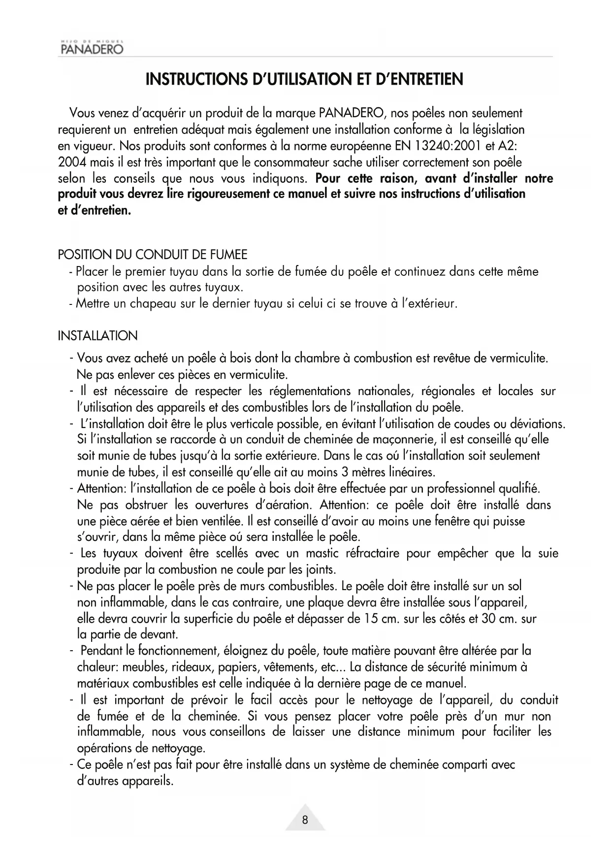 Vous venez d’acquérir un produit de la marque PANADERO, nos poêles non seulement requierent un entretien adéquat mais également une installation conforme à la législation en vigueur. Nos produits sont conformes à la norme européenne EN 13240:2001 et A2: 2004 mais il est très important que le consommateur sache utiliser correctement son poêle selon les conseils que nous vous indiquons. Pour cette raison, avant d’installer notre produit vous devrez lire rigoureusement ce manuel et suivre nos instructions d’utilisation et d’entretien.