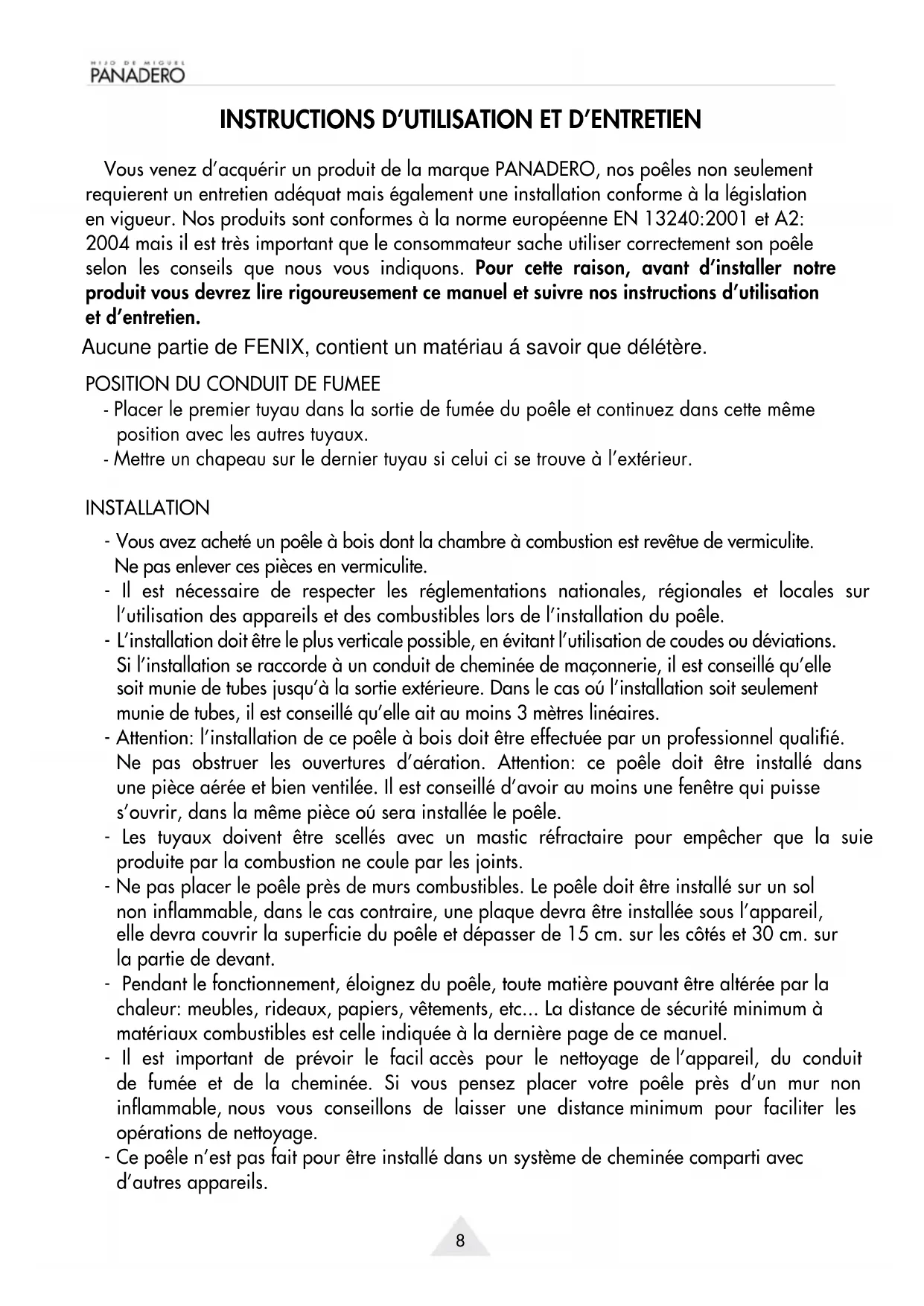 FENIX - Poêle PANADERO - Notice d'utilisation et mode d'emploi gratuit