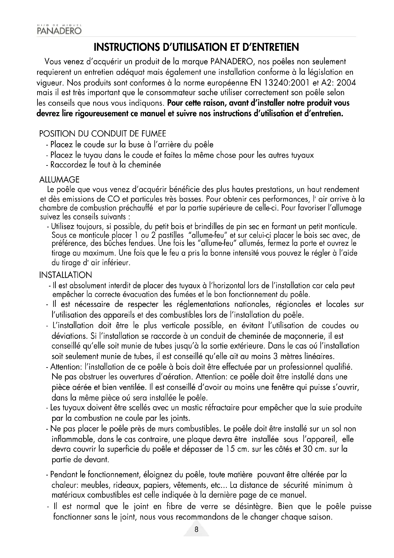 tirage au maximum. Une fois que le feu a pris la bonne intensité vous pouvez le régler à l’aide préférence, des bûches fendues. Une fois les “allume-feu” allumés, fermez la porte et ouvrez le Sous ce monticule placer 1 ou 2 pastilles “allume-feu” et sur celui-ci placer le bois sec avec, de et par la partie supérieure de celle-ci. Pour favoriser l’allumage chambre de combustion préchauffé et dès emissions de CO et particules très basses. Pour obtenir ces performances, l' air arrive à la Le poêle que vous venez d’acquérir bénéficie des plus hautes prestations, un haut rendement - Il est absolument interdit de placer des tuyaux à l’horizontal lors de l’installation car cela peut Vous venez d’acquérir un produit de la marque PANADERO, nos poêles non seulement requierent un entretien adéquat mais également une installation conforme à la législation en vigueur. Nos produits sont conformes à la norme européenne EN 13240:2001 et A2: 2004 mais il est très important que le consommateur sache utiliser correctement son poêle selon les conseils que nous vous indiquons. Pour cette raison, avant d’installer notre produit vous devrez lire rigoureusement ce manuel et suivre nos instructions d’utilisation et d’entretien.