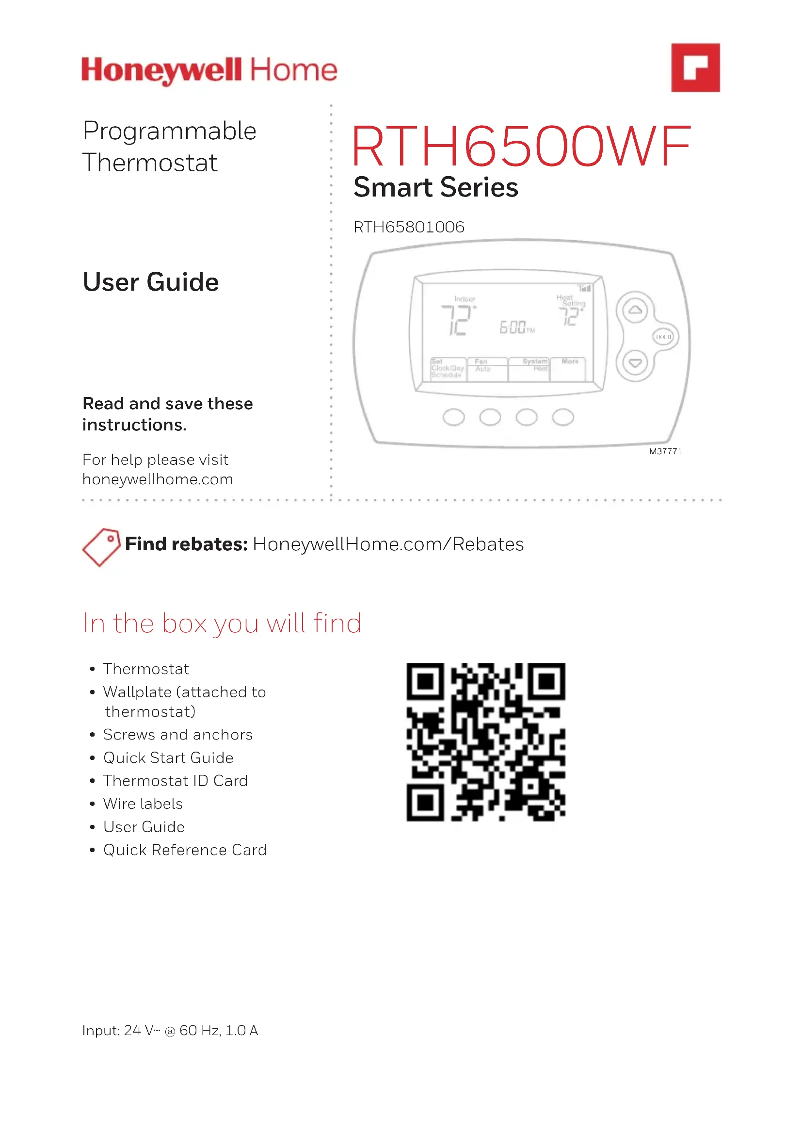 °3 69-2715EF—07 Configuration de votre thermostat La configuration de votre thermostat programmable est aisée. Il est préprogrammé et prêt à fonctionner dès qu’il est installé et enregistré. Installez votre thermostat. Connectez réseau sans fil de votre domicile. Enregistrez-vous en ligne pour bénéficier de l’accès à distance. Avant de commencer, vous désirerez peut-être visionner une courte vidéo d’installation. Utilisez le QR Code® figurant sur la couverture de ce guide ou consultez le site honeywellhome.com/support