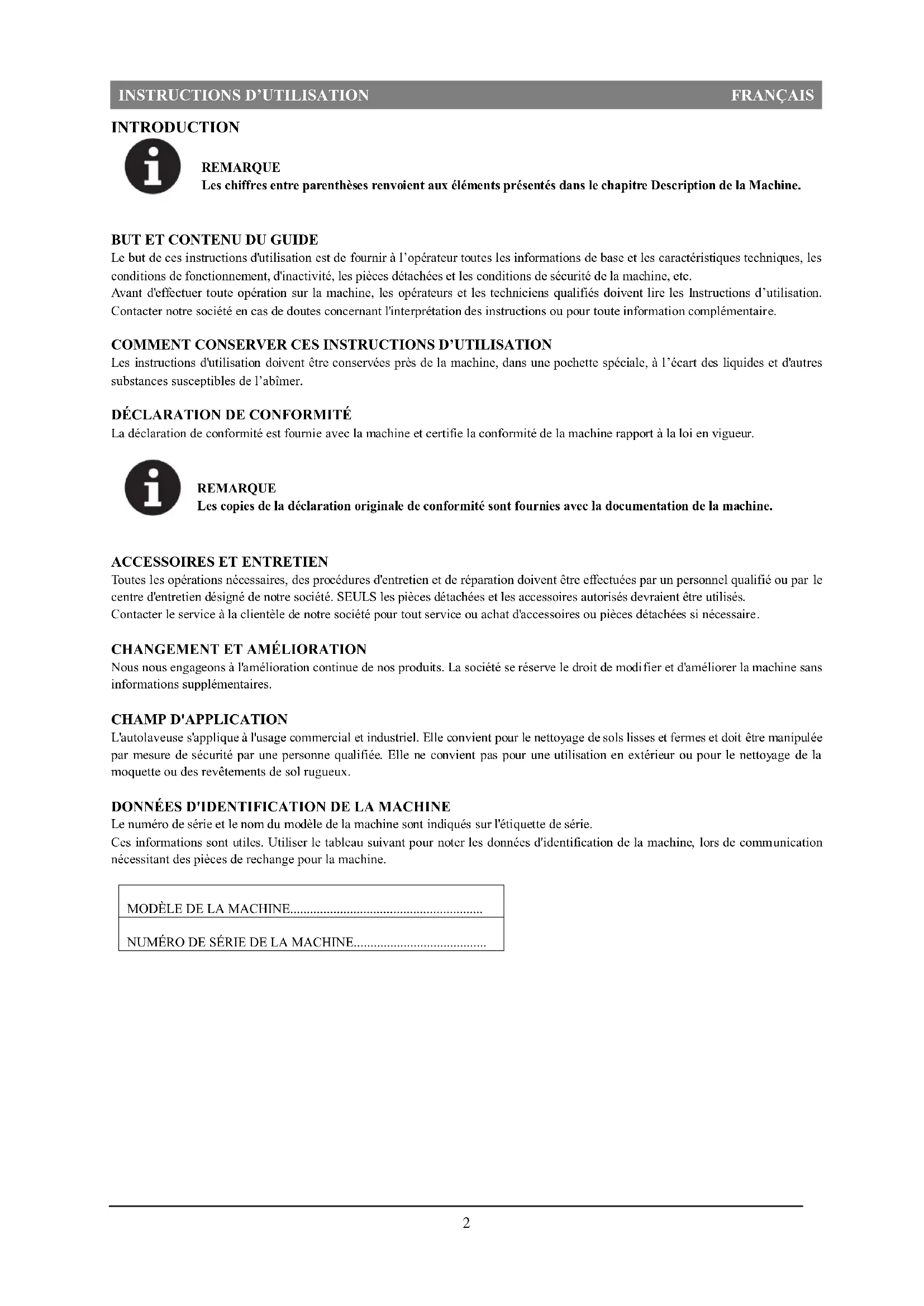 Le numéro de série et le nom du modèle de la machine sont indiqués sur l'étiquette de série. Ces informations sont utiles. Utiliser le tableau suivant pour noter les données d'identification de la machine, lors de communication nécessitant des pièces de rechange pour la machine. MODÈLE DE LA MACHINE.......................................................... NUMÉRO DE SÉRIE DE LA MACHINE........................................INSTRUCTIONS D’UTILISATION FRANÇAIS