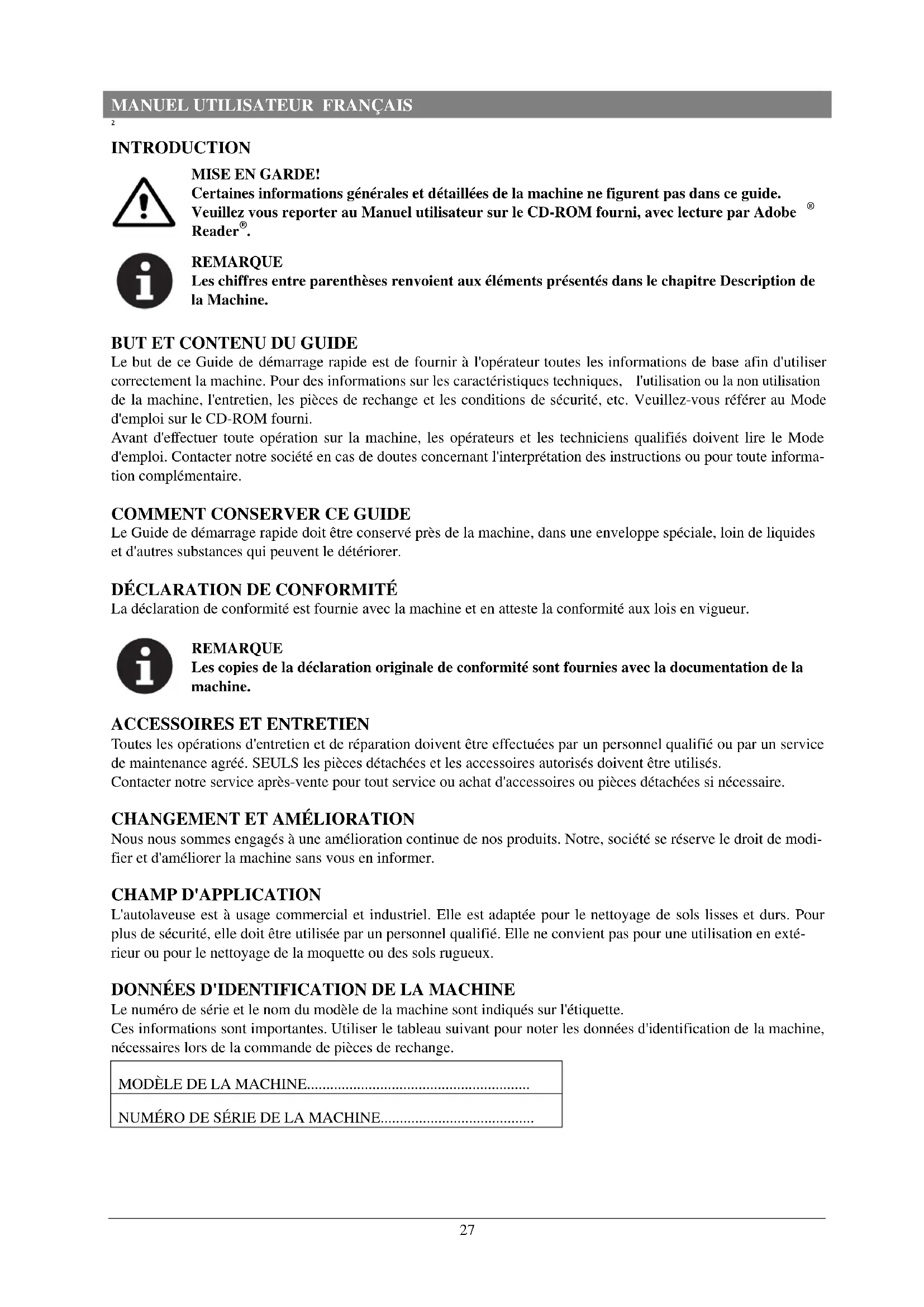 Le numéro de série et le nom du modèle de la machine sont indiqués sur l'étiquette. Ces informations sont importantes. Utiliser le tableau suivant pour noter les données d'identification de la machine, nécessaires lors de la commande de pièces de rechange. MODÈLE DE LA MACHINE.......................................................... NUMÉRO DE SÉRIE DE LA MACHINE........................................MANUEL UTILISATEUR FRANÇAIS