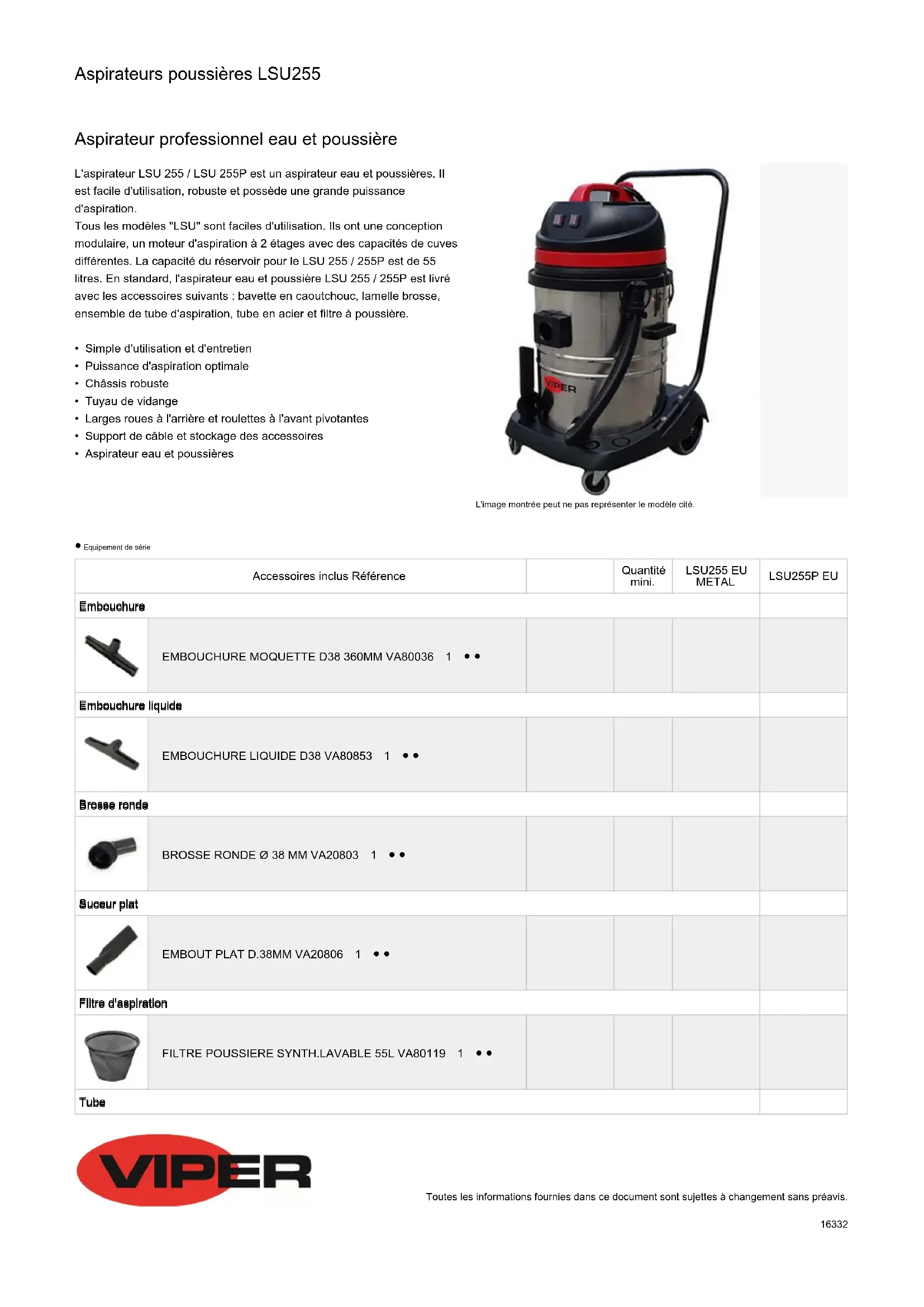 Tube Tube Tube Tube Aspirateurs poussières LSU255Aspirateur professionnel eau et poussière Toutes les informations fournies dans ce document sont sujettes à changement sans préavis.