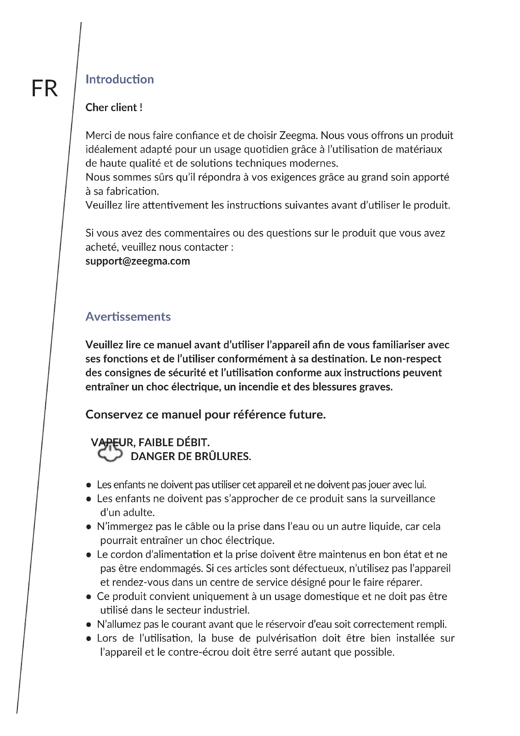 - Remeez toutes les pièces du kit dans l’emballage. Stockez-les dans un endroit sec et bien venlé. L’eau du robinet ordinaire peut être ulisée pour remplir le réservoir. Si l’eau du robinet là où vous vivez est calcaire, l’ulisaon de l’eau du robinet peut entraîner un entartrage plus rapide de votre neoyeur à vapeur et, en n de compte, réduire sa durée de vie. Dans une telle situaon, le produit doit être reconstué avec de l’eau disllée. Videz le réservoir d’eau après chaque ulisaon an d’éviter l’accumulaon de calcaire. N’ajoutez aucun liquide au contenu du réservoir et n’ulisez pas l’eau des séchoirs à linge, l’eau parfumée ou adoucie, l’eau des réfrigérateurs, des climaseurs ou l’eau de pluie. Elles conennent des déchets organiques et des éléments minéraux qui peuvent réagir chimiquement lorsqu’elles sont chauées et causer des dommages par pulvérisaon, des taches brunes ou une usure prématurée des équipements. L’ulisaon de types d’eau non autorisés annulera la garane du fabricant. N’ulisez pas d’éponge abrasive pour neoyer l’appareil. L’appareil doit être neoyé à fond après chaque dixième ulisaon.FR Résoluon des problèmes Problème Cause possible Soluon Pas de vapeur Pas d'alimentaon Vériez que la prise de courant fonconne et que l'équipement est correctement branché. Pas d'eau dans le réservoir Pas d'eau dans le réservoir. Remplissez le réservoir avec de d'eau conformément aux instrucons du manuel (voir la secon « Ulisaon du produit »). Il n'y a pas assez de vapeur La tension est trop basse ou trop instable Vériez que la prise de courant fonconne et que l'équipement est correctement branché. Pas assez d'eau dans le réservoir Remplissez le réservoir avec de d'eau conformément aux instrucons du manuel (voir la secon « Ulisaon du produit »). Au lieu de la vapeur, l'eau s'échappe de la buse Trop d'eau dans le réservoir Versez un peu d'eau du réservoir. La quanté suggérée est de 250 ml. Le produit est trop incliné pendant l'ulisaon Le corps de la machine ne doit pas être incliné à un angle supérieur à 45 degrés pendant le fonconnement. Ne pas trop incliner l'équipement pendant le fonconnement. L'appareil prend trop de temps à chauer La tension est trop basse ou trop instable Vériez que la prise de courant fonconne et que l'équipement est correctement branché. Le produit est conforme aux exigences des direcves de l’Union européenne. Conformément à la Direcve 2012/19/UE, le présent produit est soumis à la collecte séparée. Il convient de ne pas jeter le produit avec les déchets ménagers, car il peut constuer un danger pour l’environnement et la sainte humaine. Le produit usé devrait être remis au point de recyclage des appareils électriques et électroniques. Les photos sont fournies à tre d’illustraon uniquement, l’aspect réel des produits peut diérer de celui présenté sur les photos.ES Introducción ¡Esmado Cliente! Gracias por conar en nosotros y elegir la marca Zeegma. Le ofrecemos un producto perfecto para el uso diario gracias al uso de materiales de alta calidad y modernas soluciones técnicas. Estamos seguros de que el gran cuidado de la ejecución hará que cumpla con sus requisitos. Antes de ulizar el producto, lea atentamente el siguiente manual de usuario. Si ene algún comentario o pregunta sobre el producto comprado, póngase en contacto con nosotros: support@zeegma.com Advertencias Lea este manual antes de ulizar el disposivo para familiarizarse con sus funciones y ulícelo según lo previsto. El incumplimiento de las instrucciones de seguridad y el uso contrario a las instrucciones puede provocar descargas eléctricas, incendios y lesiones graves. ¡Guarde estas instrucciones para uso futuro! VAPOR DE AGUA, FLUJO BAJO. PELIGRO DE QUEMADURAS.