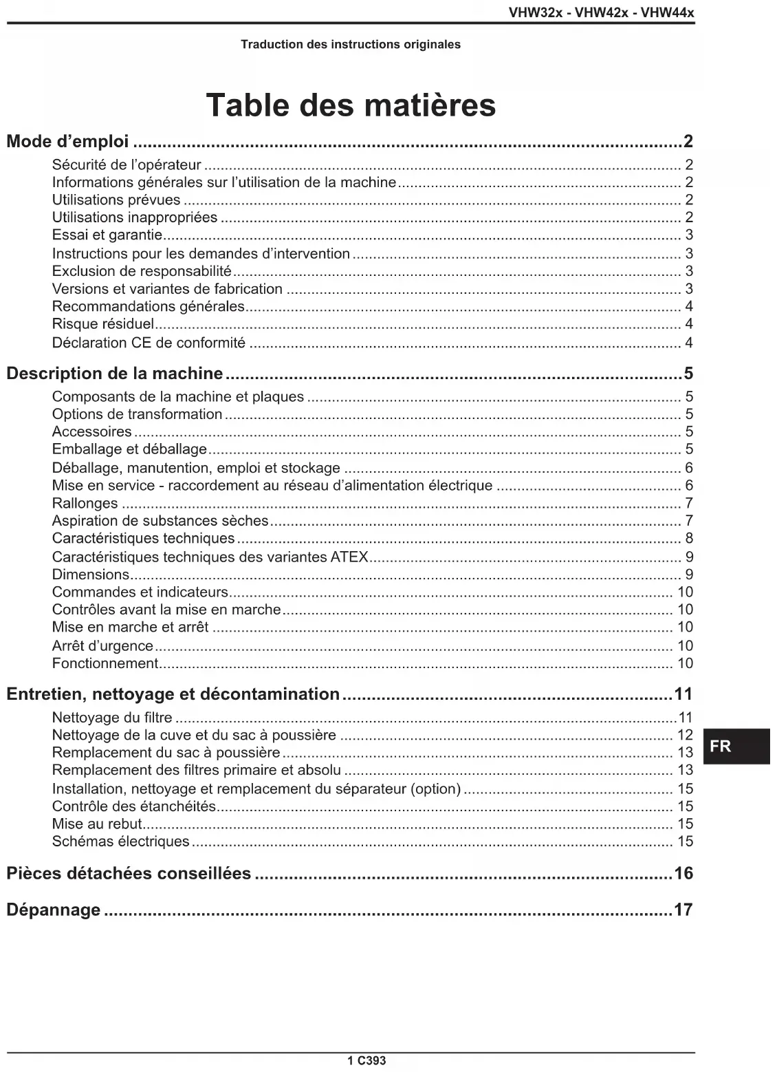 Câble H07 RN - F ATTENTION ! Variante ATEX : quand on aspire des poussières inammables, on ne peut pas utiliser de rallonges, ni de dispositifs électriques à brancher, ni d’adaptateurs. ATTENTION ! Les prises, les ches, les serre-câbles, les connecteurs et la pose du câble de la rallonge doivent être tels à maintenir le degré de protection IP indiqué sur la plaque de la machine. ATTENTION ! La prise d’alimentation de la machine doit être protégée par un coupe-circuit diérentiel à limitation du courant de défaut, qui coupe l’alimentation quand le courant dispersé vers la terre dépasse les 30 mA pendant 30 ms, ou par un circuit de protection équivalent. ATTENTION ! Ne jamais pulvériser d’eau sur la machine : ceci est dangereux pour les personnes et risque de créer un court-circuit de l’alimentation. Aspiration de substances sèches [ REMARQUE ] Les ltres fournis et le sac de collecte (s’ils sont prévus) doivent être mis en place correctement. ATTENTION ! Respecter les consignes de sécurité relatives aux matières aspirées.C393 8 VHW32x - VHW42x - VHW44x