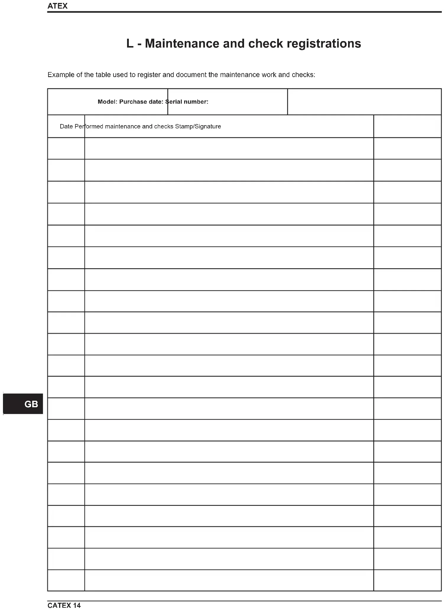 - L - Enregistrement des opérations d’entretien et des contrôles Table des matièresATEX 3 CATEX p. 14
