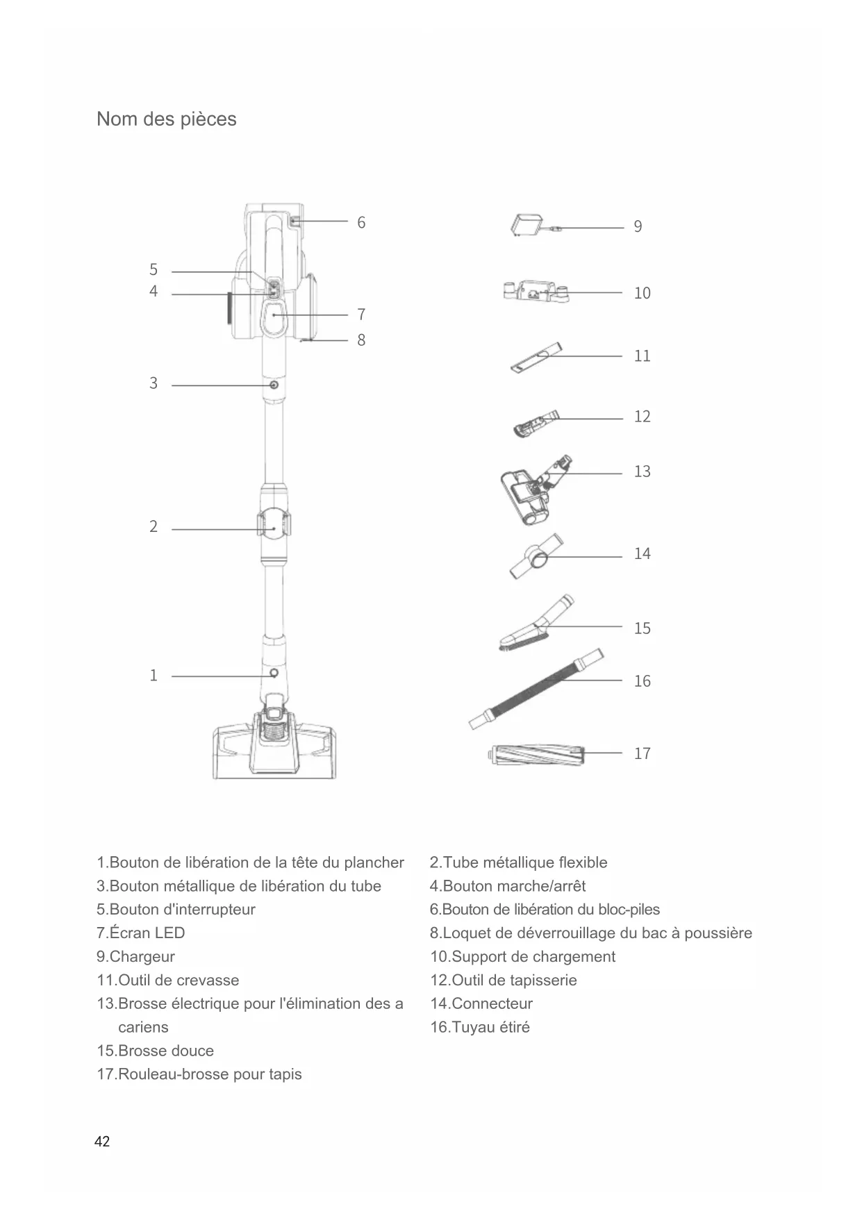 Assemblez la tête de sol avec le tube métallique et l'aspirateur à main : comme indiqué sur la photo, alignez l'aiguille conductrice du tube métallique avec le coupleur de l'embout d'aspiration, poussez vers le haut jusqu'à ce que vous entendiez un "clic". Assemblage des accessoires Pour faciliter l'utilisation, ce produit est spécialement équipé de quelques accessoires pour la partie manuelle de l'aspirateur. Lorsque vous utilisez l'aspirateur à main seul, vous pouvez connecter directement les accessoires en fonction de vos besoins ou connecter les accessoires par le biais du Tuyau étiré. Modèle H9 Flex Brosse électrique pour l'élimination des acariens Outil de tapisserie Outil de crevasse Brosse douce Tuyau étiré Connecteur Rouleau-brosse pour tapis Nom Connectez la brosse électrique pour l'élimination des acariens, l'outil de crevasse, l'outil de tapisserie et la brosse douce avec l'aspirateur portatif comme sur la photo.