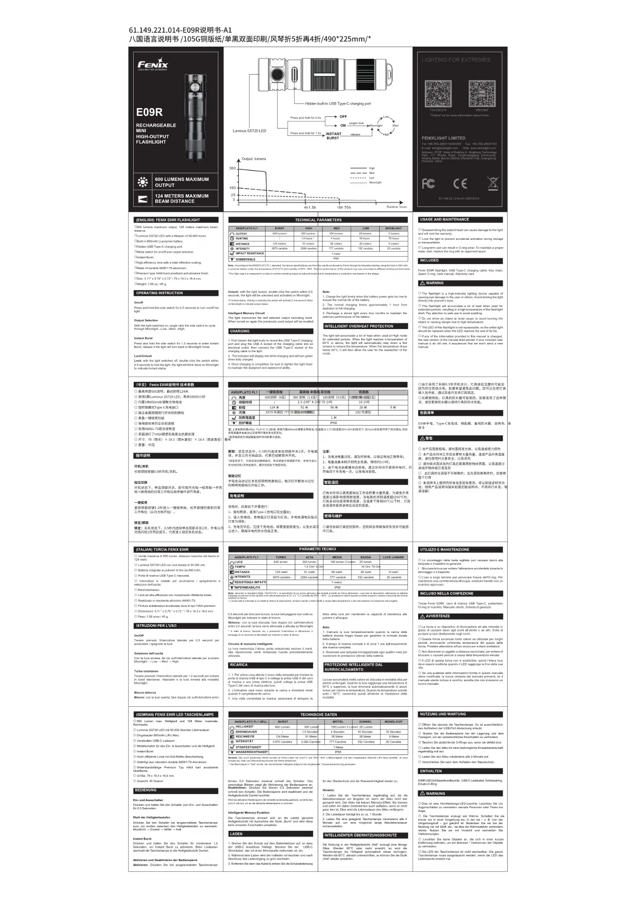 | Caractéristiques techniques | Lampe de poche Fenix E09R, puissance maximale de 600 lumens, portée jusqu'à 120 mètres, étanchéité IP68. |