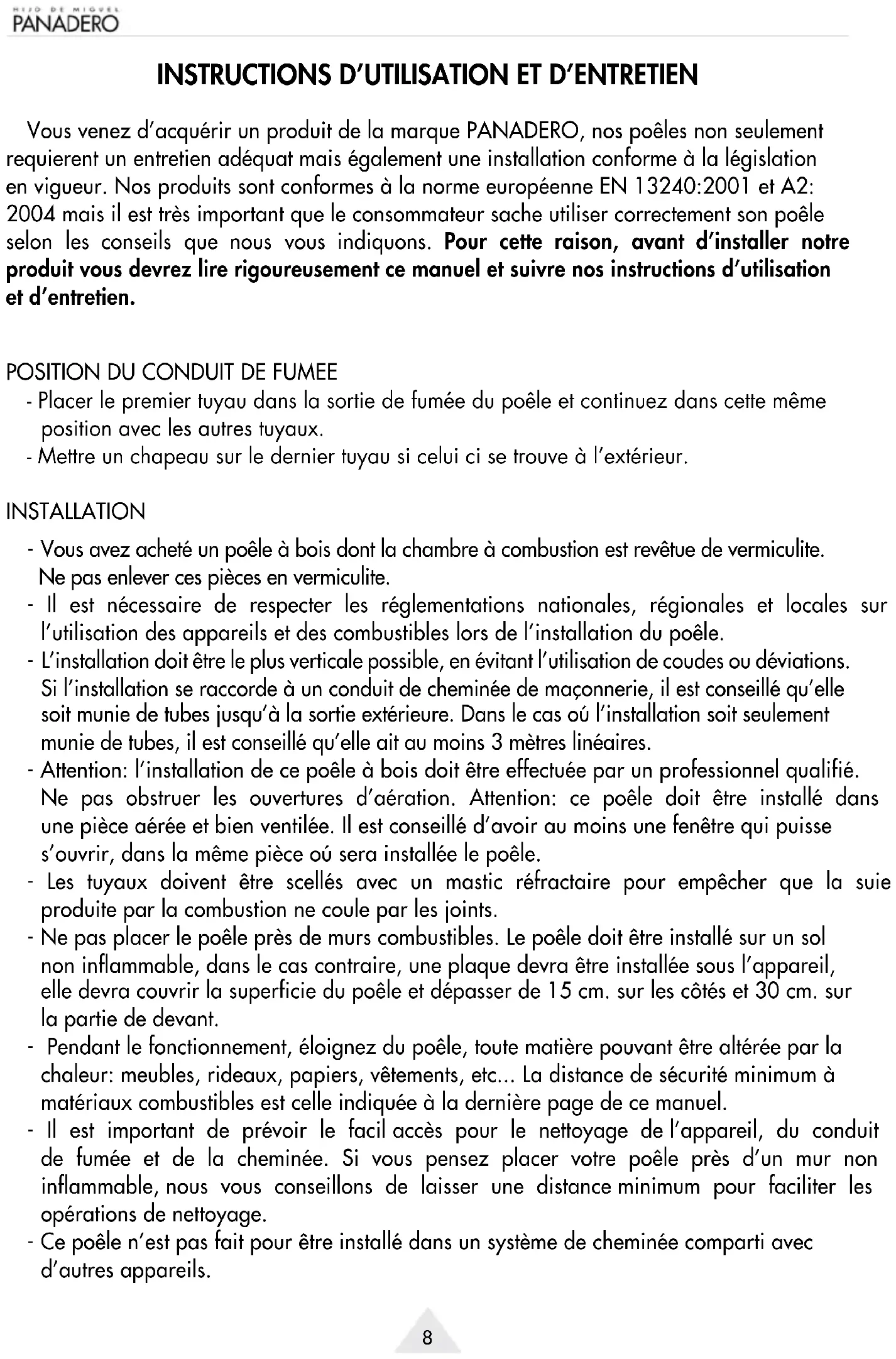 Vous venez d’acquérir un produit de la marque PANADERO, nos poêles non seulement requierent un entretien adéquat mais également une installation conforme à la législation en vigueur. Nos produits sont conformes à la norme européenne EN 13240:2001 et A2: 2004 mais il est très important que le consommateur sache utiliser correctement son poêle selon les conseils que nous vous indiquons. Pour cette raison, avant d’installer notre produit vous devrez lire rigoureusement ce manuel et suivre nos instructions d’utilisation et d’entretien.