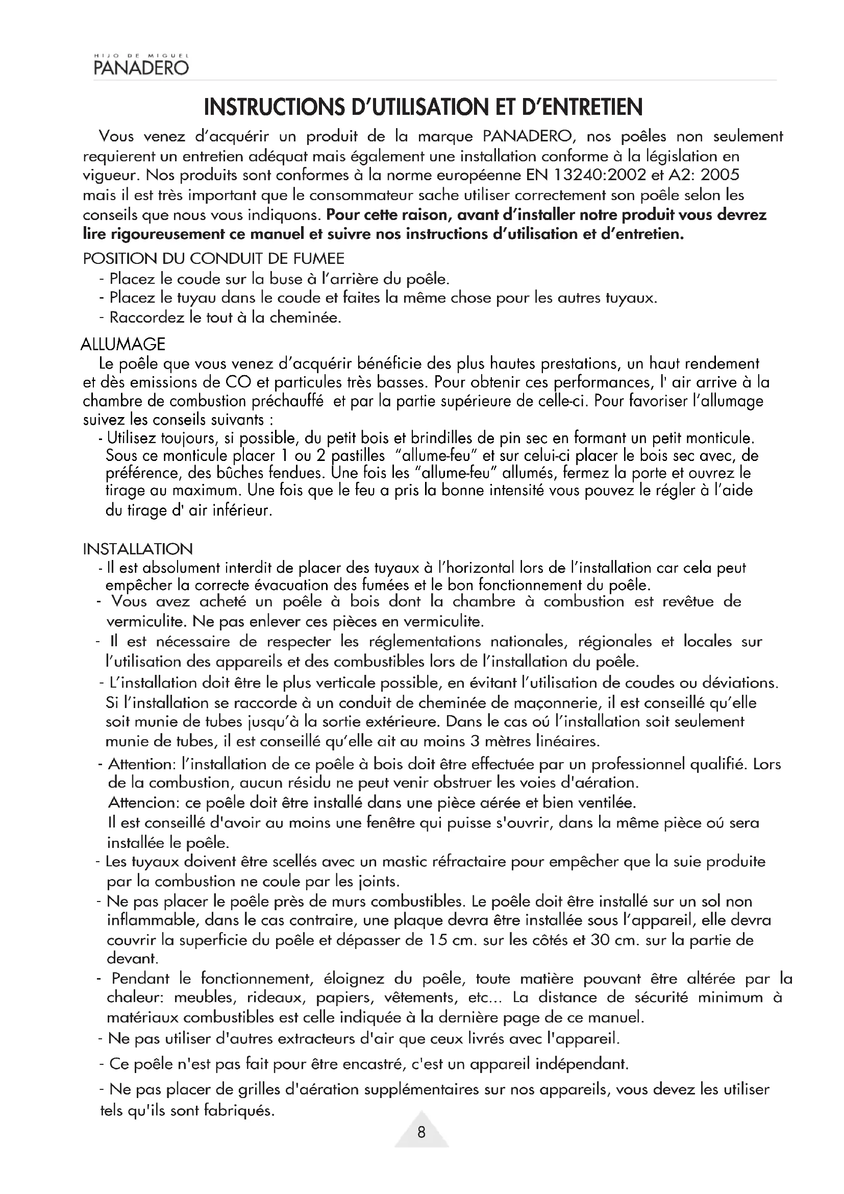 Vous venez d’acquérir un produit de la marque PANADERO, nos poêles non seulement requierent un entretien adéquat mais également une installation conforme à la législation en vigueur. Nos produits sont conformes à la norme européenne EN 13240:2002 et A2: 2005 mais il est très important que le consommateur sache utiliser correctement son poêle selon les conseils que nous vous indiquons. Pour cette raison, avant d’installer notre produit vous devrez lire rigoureusement ce manuel et suivre nos instructions d’utilisation et d’entretien.