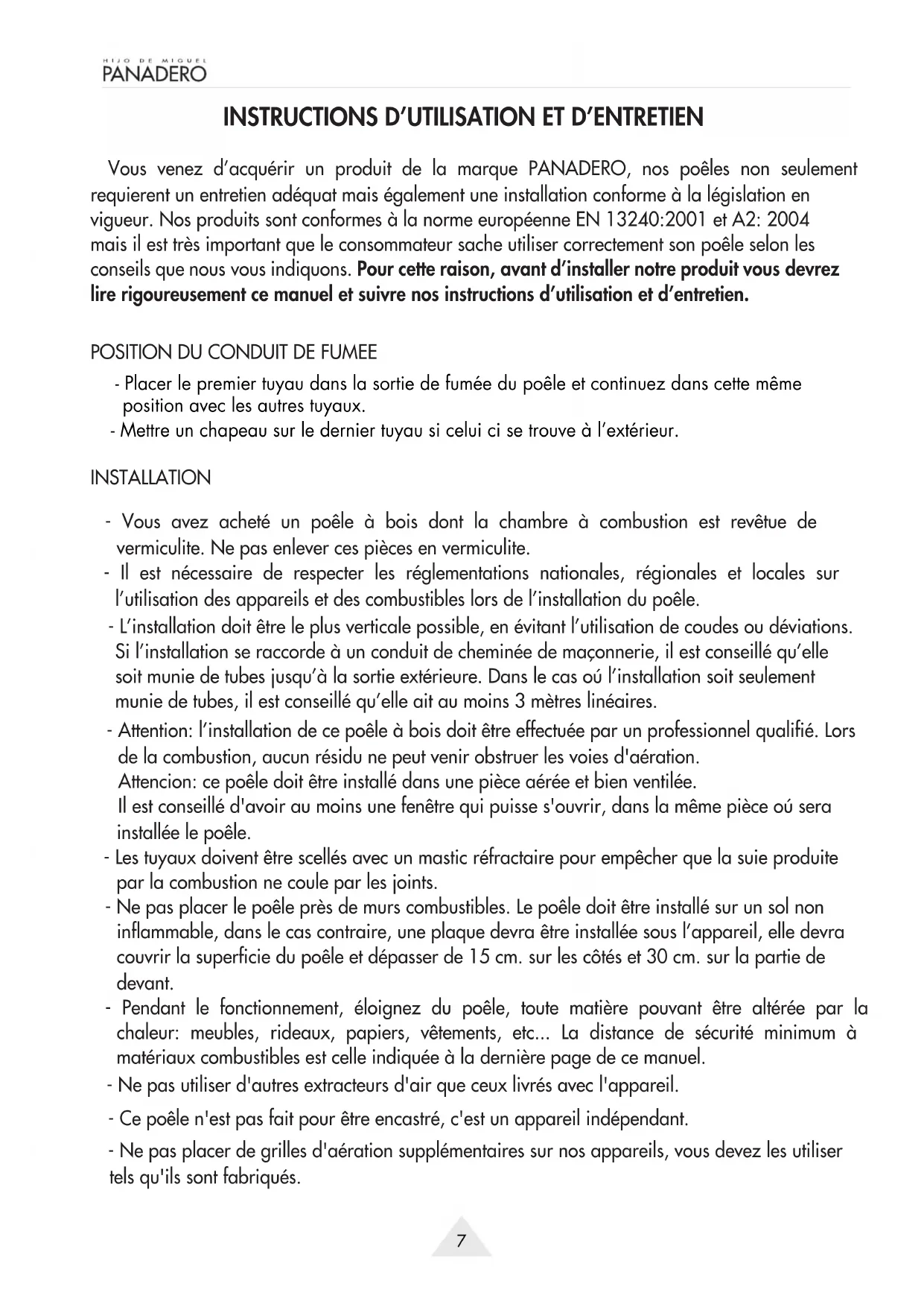 Vous venez d’acquérir un produit de la marque PANADERO, nos poêles non seulement requierent un entretien adéquat mais également une installation conforme à la législation en vigueur. Nos produits sont conformes à la norme européenne EN 13240:2001 et A2: 2004 mais il est très important que le consommateur sache utiliser correctement son poêle selon les conseils que nous vous indiquons. Pour cette raison, avant d’installer notre produit vous devrez lire rigoureusement ce manuel et suivre nos instructions d’utilisation et d’entretien.