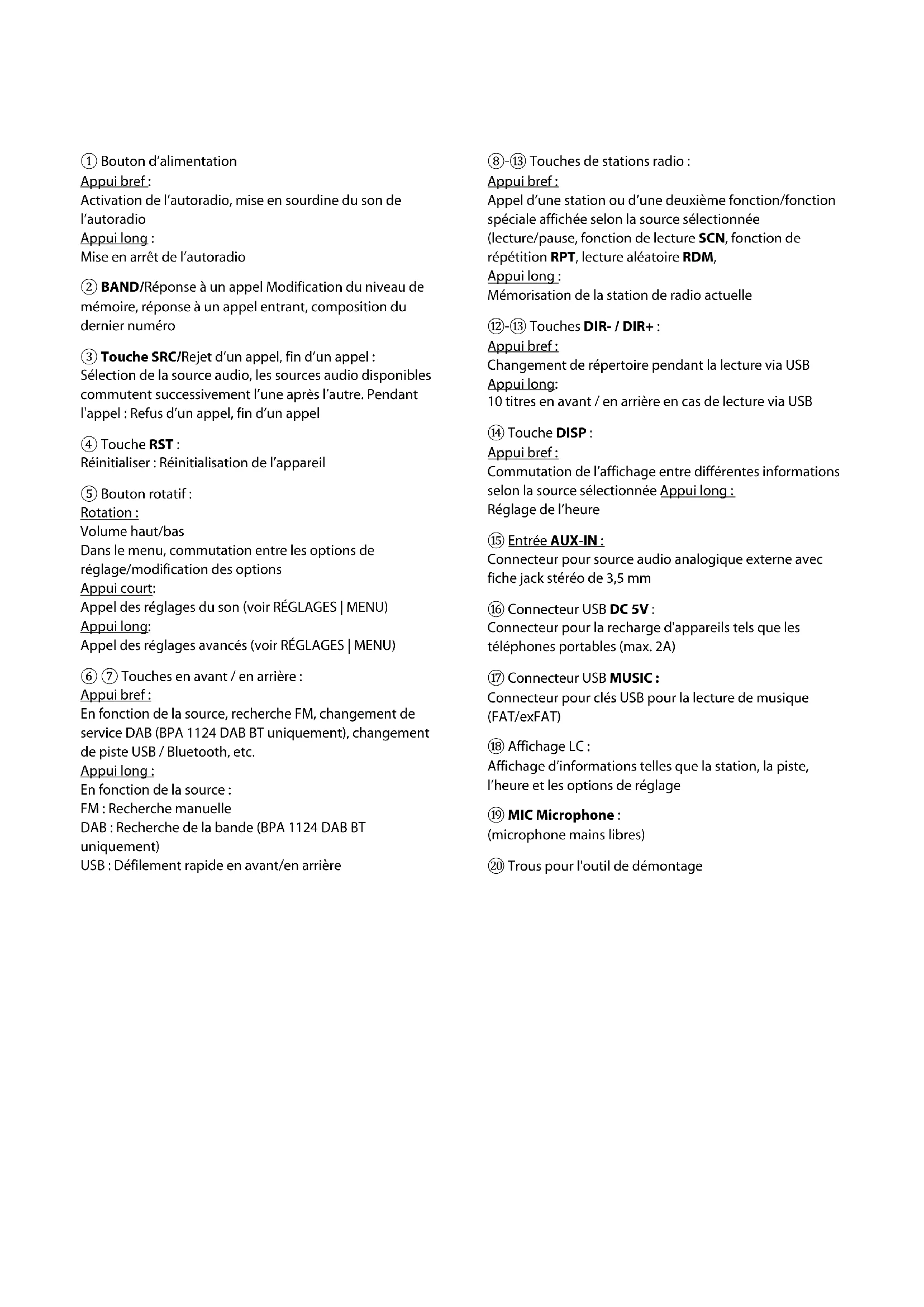 Appui bref : Activation de l’autoradio, mise en sourdine du son de l’autoradio Appui long : Mise en arrêt de l’autoradio ② BAND/Réponse à un appel Modification du niveau de mémoire, réponse à un appel entrant, composition du dernier numéro ③ Touche SRC/Rejet d’un appel, fin d’un appel : Sélection de la source audio, les sources audio disponibles commutent successivement l’une après l’autre. Pendant l'appel : Refus d’un appel, fin d’un appel ④ Touche RST : Réinitialiser : Réinitialisation de l’appareil ⑤ Bouton rotatif : Rotation : Volume haut/bas Dans le menu, commutation entre les options de réglage/modification des options Appui court: Appel des réglages du son (voir RÉGLAGES | MENU) Appui long: Appel des réglages avancés (voir RÉGLAGES | MENU) ⑥ ⑦ Touches en avant / en arrière : Appui bref : En fonction de la source, recherche FM, changement de service DAB (BPA 1124 DAB BT uniquement), changement de piste USB / Bluetooth, etc. Appui long : En fonction de la source : FM : Recherche manuelle DAB : Recherche de la bande (BPA 1124 DAB BT uniquement) USB : Défilement rapide en avant/en arrière ⑧-⑬ Touches de stations radio : Appui bref : Appel d’une station ou d’une deuxième fonction/fonction spéciale affichée selon la source sélectionnée (lecture/pause, fonction de lecture SCN, fonction de répétition RPT, lecture aléatoire RDM, Appui long : Mémorisation de la station de radio actuelle ⑫-⑬ Touches DIR- / DIR+ : Appui bref : Changement de répertoire pendant la lecture via USB Appui long: 10 titres en avant / en arrière en cas de lecture via USB ⑭ Touche DISP : Appui bref : Commutation de l’affichage entre différentes informations selon la source sélectionnée Appui long : Réglage de l’heure ⑮ Entrée AUX-IN : Connecteur pour source audio analogique externe avec fiche jack stéréo de 3,5 mm ⑯ Connecteur USB DC 5V : Connecteur pour la recharge d'appareils tels que les téléphones portables (max. 2A) ⑰ Connecteur USB MUSIC : Connecteur pour clés USB pour la lecture de musique (FAT/exFAT) ⑱ Affichage LC : Affichage d’informations telles que la station, la piste, l’heure et les options de réglage ⑲ MIC Microphone : (microphone mains libres) ⑳ Trous pour l'outil de démontageFR