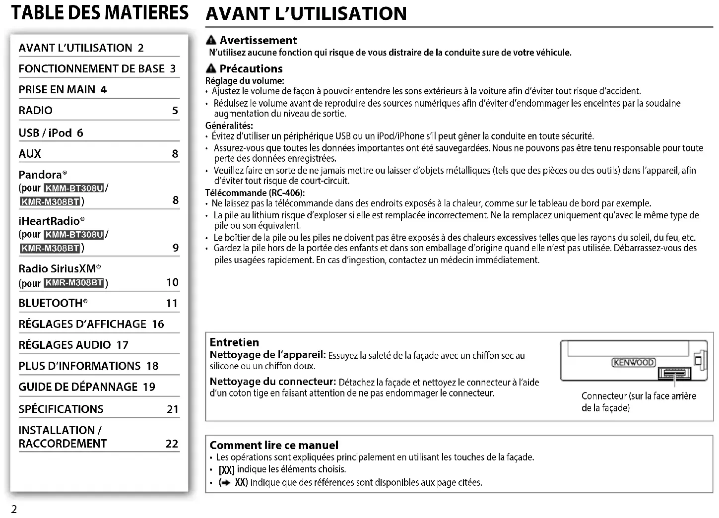 XX) indique que des références sont disponibles aux page citées. Entretien Nettoyage de l’appareil: Essuyez la saleté de la façade avec un chiffon sec au silicone ou un chiffon doux. Nettoyage du connecteur: Détachez la façade et nettoyez le connecteur à l’aide d’un coton tige en faisant attention de ne pas endommager le connecteur. Connecteur (sur la face arrière de la façade) FR_KMM_BT308U_KN_1.indd 2FR_KMM_BT308U_KN_1.indd 2 21/11/2013 11:02:08 AM21/11/2013 11:02:08 AM3 Data Size: B6L (182 mm x 128 mm) Book Size: B6L (182 mm x 128 mm) KMM-BT308