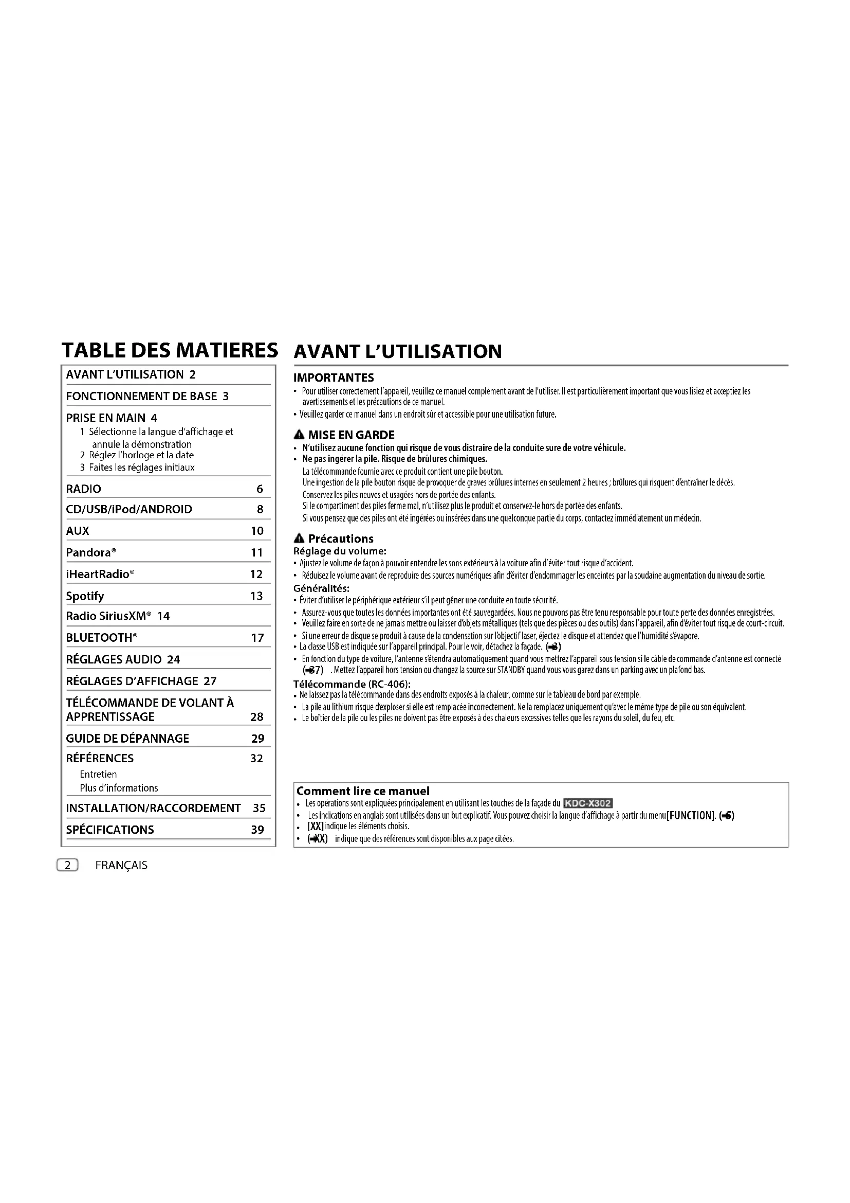 1 Sélectionne la langue d’affichage et annule la démonstration 2 Réglez l’horloge et la date 3 Faites les réglages initiaux RADIO 6 CD/USB/iPod/ANDROID 8 AUX 10 Pandora® 11 iHeartRadio® 12 Spotify 13 Radio SiriusXM® 14 BLUETOOTH® 17