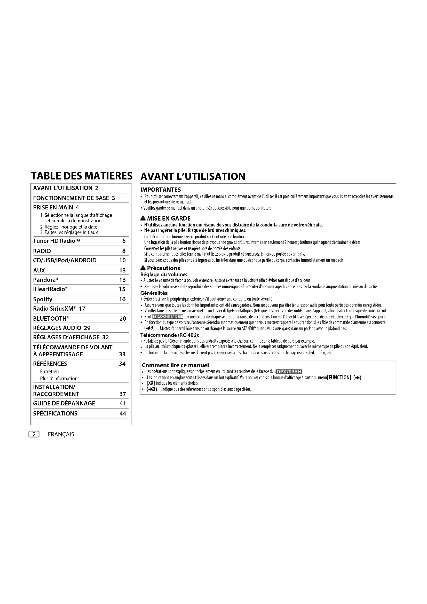 Le boîtier de la pile ou les piles ne doivent pas être exposés à des chaleurs excessives telles que les rayons du soleil, du feu, etc. Comment lire ce manuel