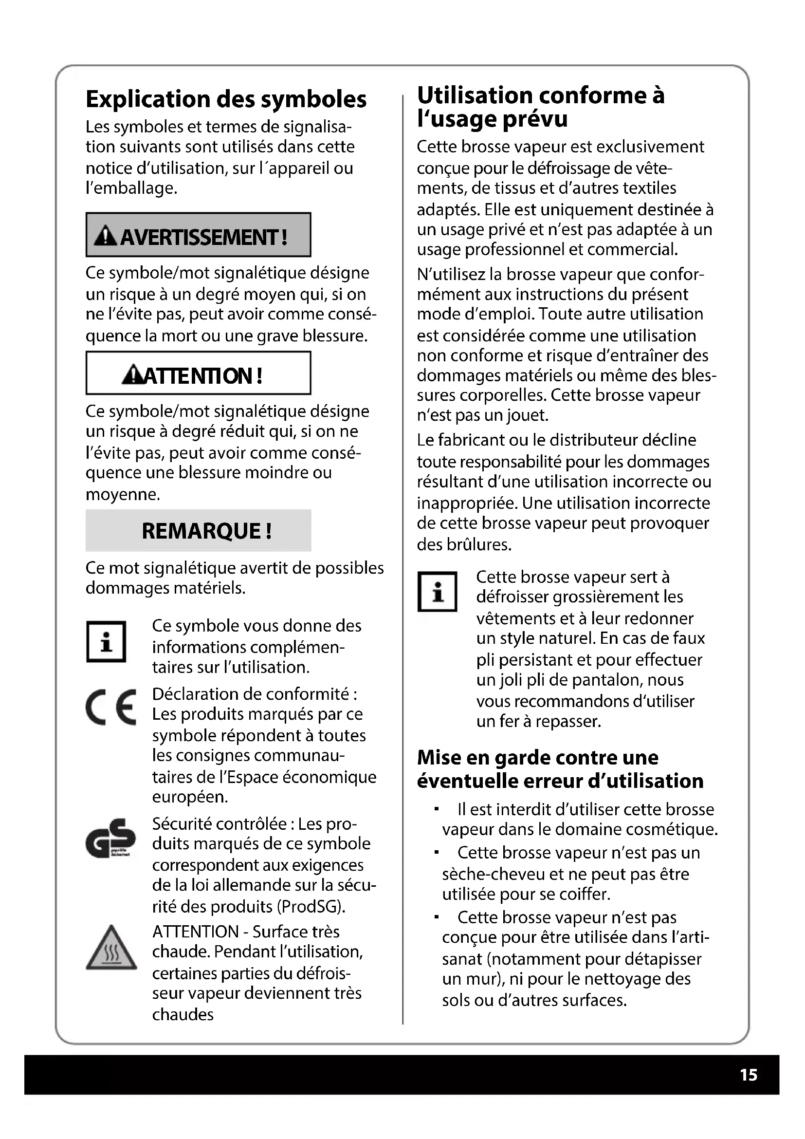 Explication des symboles Les symboles et termes de signalisa- tion suivants sont utilisés dans cette notice d’utilisation, sur l´appareil ou l’emballage. AVERTISSEMENT ! Ce symbole/mot signalétique désigne un risque à un degré moyen qui, si on ne l’évite pas, peut avoir comme consé- quence la mort ou une grave blessure. ATTE NTI ON ! Ce symbole/mot signalétique désigne un risque à degré réduit qui, si on ne l’évite pas, peut avoir comme consé- quence une blessure moindre ou moyenne. REMARQUE ! Ce mot signalétique avertit de possibles dommages matériels. Ce symbole vous donne des informations complémen- taires sur l’utilisation. Déclaration de conformité : Les produits marqués par ce symbole répondent à toutes les consignes communau- taires de l’Espace économique européen. Sécurité contrôlée : Les pro- duits marqués de ce symbole correspondent aux exigences de la loi allemande sur la sécu- rité des produits (ProdSG). ATTENTION - Surface très chaude. Pendant l’utilisation, certaines parties du défrois- seur vapeur deviennent très chaudes Utilisation conforme à l‘usage prévu Cette brosse vapeur est exclusivement conçue pour le défroissage de vête- ments, de tissus et d’autres textiles adaptés. Elle est uniquement destinée à un usage privé et n’est pas adaptée à un usage professionnel et commercial. N’utilisez la brosse vapeur que confor- mément aux instructions du présent mode d’emploi. Toute autre utilisation est considérée comme une utilisation non conforme et risque d’entraîner des dommages matériels ou même des bles- sures corporelles. Cette brosse vapeur n‘est pas un jouet. Le fabricant ou le distributeur décline toute responsabilité pour les dommages résultant d’une utilisation incorrecte ou inappropriée. Une utilisation incorrecte de cette brosse vapeur peut provoquer des brûlures. Cette brosse vapeur sert à défroisser grossièrement les vêtements et à leur redonner un style naturel. En cas de faux pli persistant et pour effectuer un joli pli de pantalon, nous vous recommandons d‘utiliser un fer à repasser. Mise en garde contre une éventuelle erreur d’utilisation Il est interdit d’utiliser cette brosse vapeur dans le domaine cosmétique. Cette brosse vapeur n’est pas un sèche-cheveu et ne peut pas être utilisée pour se coiffer. Cette brosse vapeur n’est pas conçue pour être utilisée dans l’arti- sanat (notamment pour détapisser un mur), ni pour le nettoyage des sols ou d’autres surfaces.16 Consignes de sécurité AVERTISSEMENT ! Risque d’électrocution ! Une installation électrique défectueuse, une tension de réseau trop élevée et une manipulation inappropriée d’un appareil électrique peuvent provoquer des chocs électriques. Pour produire de la vapeur, le réser- voir de l’appareil doit être rempli d’eau. N’immergez jamais l’appareil ainsi que le câble et la che d’ali- mentation dans l’eau ou dans tout autre liquide pour éviter tout risque d’électrocution. N’utilisez jamais l’appareil dans un environnement humide ou dans un environnement présentant une forte humidité de l’air. Raccordez l’appareil à une prise installée de manière conforme dont la tension répond aux « données techniques ». Veillez à ce que la prise de courant soit bien accessible a n de pouvoir débrancher rapidement la che secteur en cas de besoin. N’utilisez pas la brosse vapeur si l’ap- pareil, le câble de raccordement ou la che secteur sont endommagés ou si l’appareil est tombé, en cas de vices apparents ou de fuites. Assurez-vous que le câble électrique n‘est pas endommagé par des arêtes vives ou des objets chauds. Ne manipulez pas la brosse vapeur avec des mains mouillées. N’orientez pas le jet de vapeur en direction d’appareils électriques (téléviseur, four, etc.) ou d’instal- lations électriques (interrupteurs, prises de courant, etc.). Retirez la che secteur de la prise de courant si vous n’utilisez pas la brosse vapeur, avant de nettoyer l’appareil, de remplir le réservoir d’eau, de le déplacer ou de le ranger et en cas de dysfonctionnement pendant l’utilisation ou pendant un orage. Tirez toujours sur la che secteur pour le débrancher, pas sur le câble. N’enroulez pas le câble d’alimenta- tion autour de la brosse vapeur. N’utilisez pas de rallonge électrique. Ne modi ez pas l‘appareil ou le câble d’alimentation. Con ez les réparations exclusivement à un ate- lier spécialisé. Respectez les condi- tions de garantie. Si la brosse vapeur, le câble d’ali- mentation ou la che secteur sont endommagés, faites-les réparer par le fabricant ou par un atelier spécialisé pour éviter toute mise en danger. N‘utilisez pas cet appareil près de baignoires, de piscines, de douches ou d‘autres récipients contenant de l‘eau. Risque d’électrocution ! Si le câble d‘alimentation de l’appa- reil est endommagé, il doit être rem- placé par le fabricant ou son service après-vente ou par une personne de quali cation similaire a n d’éviter toute mise en danger. Ne pas enrouler le câble d’alimen- tation autour de l’appareil ou de parties de l’appareil. Un mauvais enroulement peut endommager l’isolation du câble et entraîner un risque d’électrocution. AVERTISSEMENT ! Risques pour les enfants et personnes à capacités physiques, sensorielles17