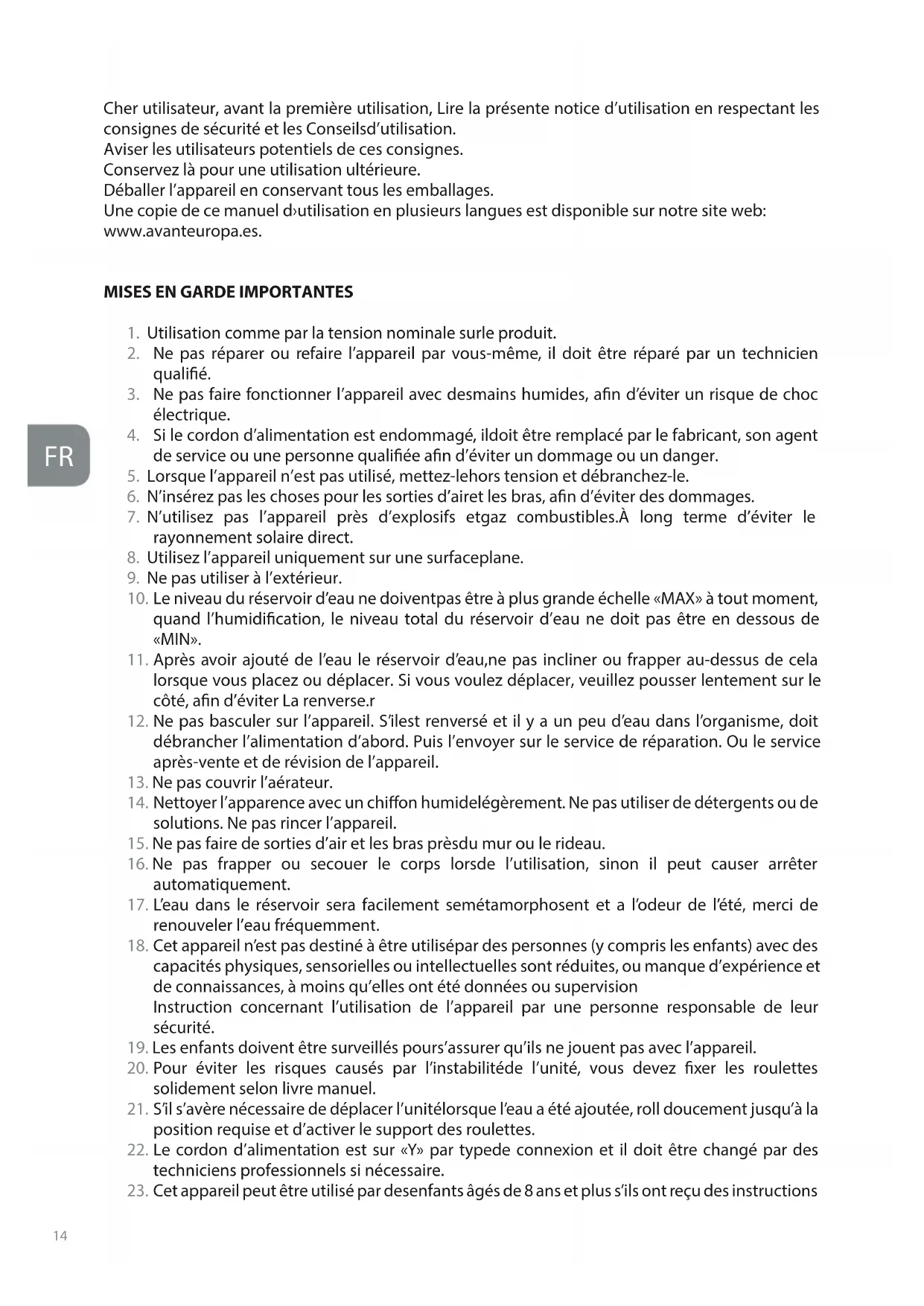 Cher utilisateur, avant la première utilisation, Lire la présente notice d’utilisation en respectant les consignes de sécurité et les Conseilsd’utilisation. Aviser les utilisateurs potentiels de ces consignes. Conservez là pour une utilisation ultérieure. Déballer l’appareil en conservant tous les emballages. Une copie de ce manuel d›utilisation en plusieurs langues est disponible sur notre site web: www.avanteuropa.es.