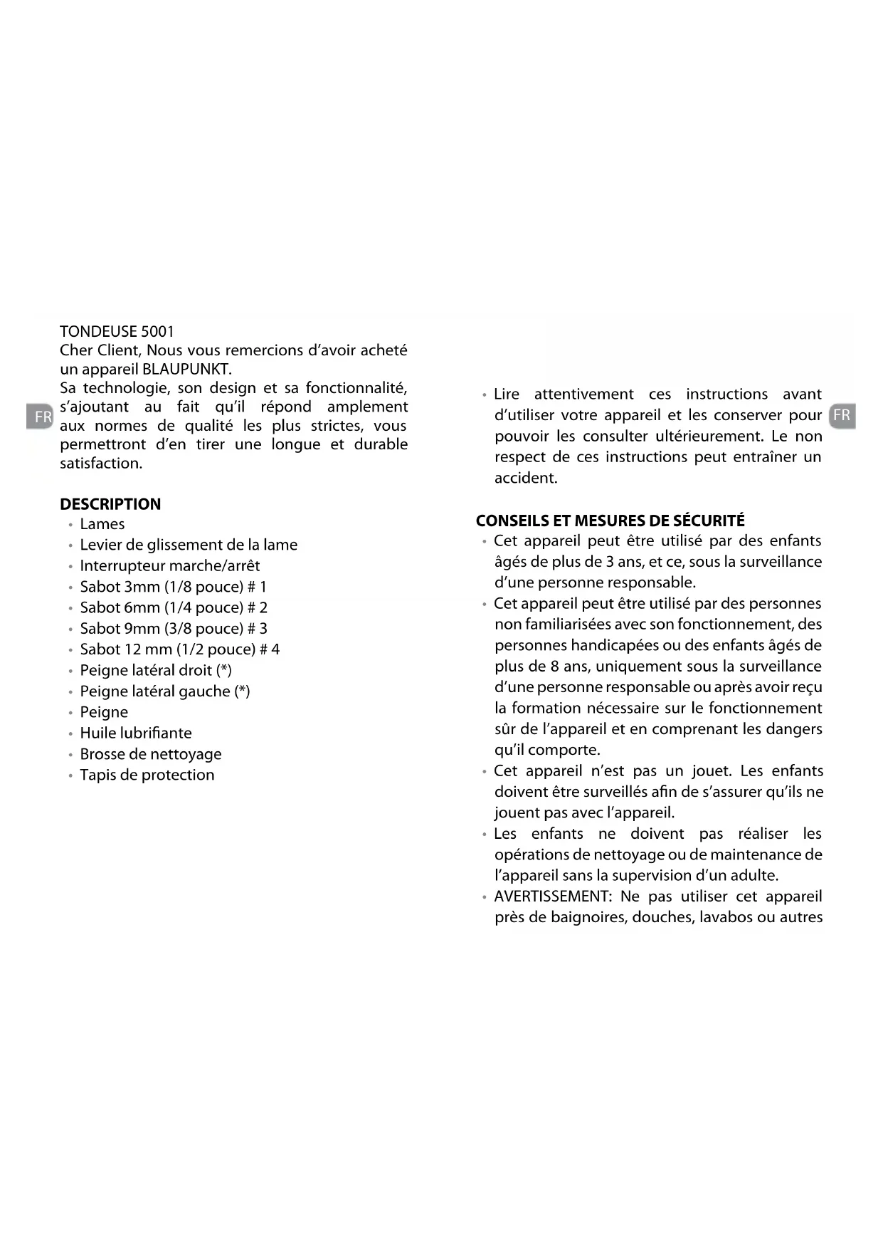 TONDEUSE 5001 Cher Client, Nous vous remercions d’avoir acheté un appareil BLAUPUNKT. Sa technologie, son design et sa fonctionnalité, s’ajoutant au fait qu’il répond amplement aux normes de qualité les plus strictes, vous permettront d’en tirer une longue et durable satisfaction. DESCRIPTION