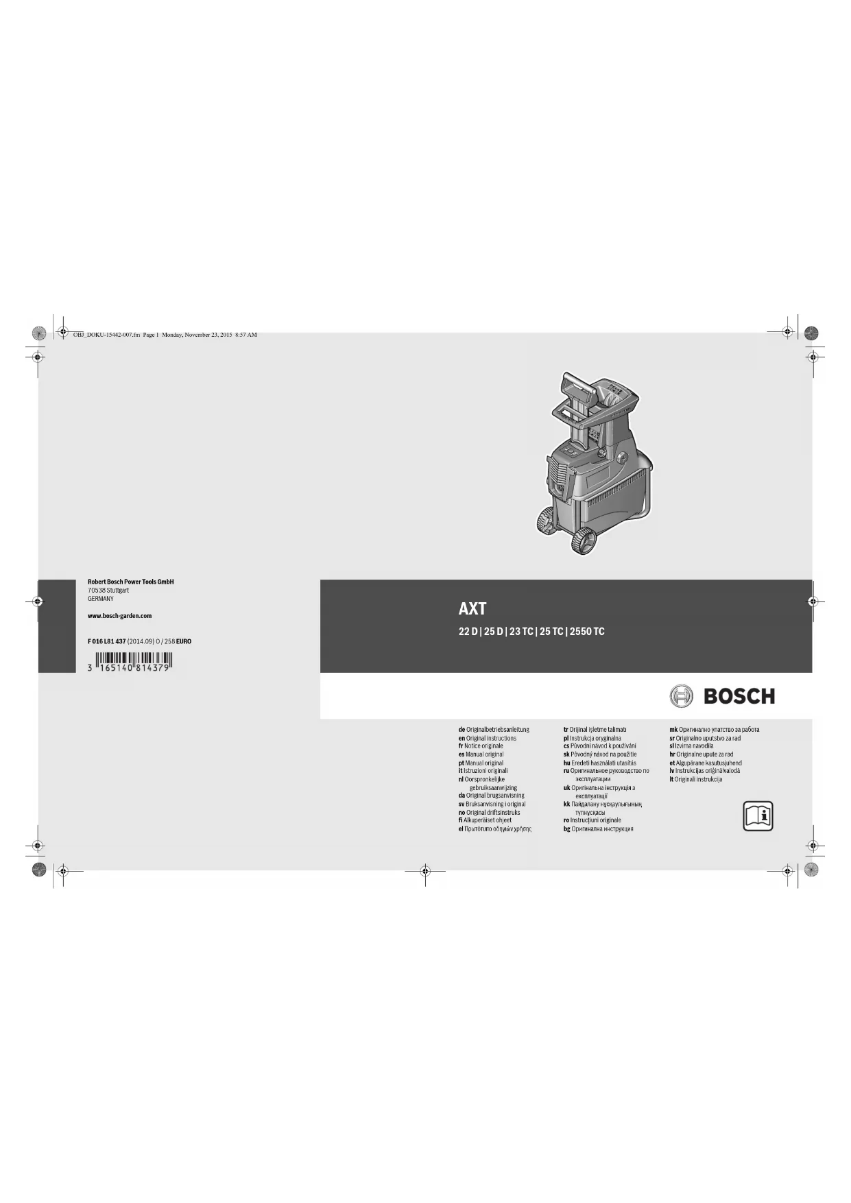 Suivant la nature des déchets à broyer. Les processus de mise en fonctionnement provoquent des baisses de tension momentanées. En cas de conditions défavorables de secteur, il peut y avoir des répercussions sur d’autres appareils. Pour des impédances de secteur inférieures à 0,36 ohms, il est assez improbable que des perturba- tions se produisent. OBJ_BUCH-895-007.book Page 26 Monday, November 23, 2015 8:59 AMFrançais | 27 Bosch Power Tools F 016 L81 437 | (23.11.15) Niveau sonore et vibrations Déclaration de conformité Catégorie des produits : 50 Dossier technique (2006/42/CE, 2000/14/CE) auprès de : Bosch Lawn and Garden Ltd., PT-HG/ENS-PA2, Stowmarket, Suffolk IP14 1EY, England Robert Bosch Power Tools GmbH 70538 Stuttgart, GERMANY Stuttgart, 01.01.2017 Montage Pour votre sécurité Attention ! Avant d’effectuer des travaux de mainte- nance ou de nettoyage, arrêter l’outil de jardin et dé- brancher la fiche de la prise de courant. Ceci vaut éga- lement lorsque le câble électrique est endommagé, coupé ou emmêlé. Respecter la tension du réseau : La tension de la source de courant doit correspondre aux les indications se trouvant sur la plaque signalétique de l’outil de jardin. Les outils de jardin marqués 230 V peuvent également fonctionner sous 220/240 V. Le circuit électrique doit être protégé au moins comme suit : AXT 22 D/25 D/23 TC/25 TC/2500 TC = 13 A L’utilisation d’une rallonge électrique dont la section de conducteur est trop faible entraîne une réduction importante de la puissance de l’outil de jardin. La section du conducteur d’un câble dont la longueur est inférieure à 25 m doit être égale à 3x 1,5 mm