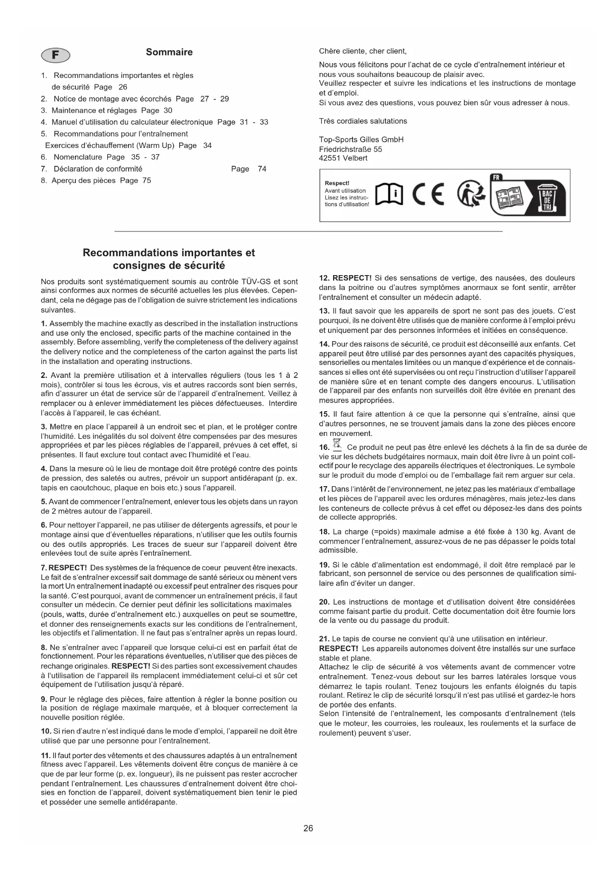 Assembly and exercise instructions 1 36-1935-68-BT26 Chère cliente, cher client, Nous vous félicitons pour l’achat de ce cycle d’entraînement intérieur et nous vous souhaitons beaucoup de plaisir avec. Veuillez respecter et suivre les indications et les instructions de montage et d’emploi. Si vous avez des questions, vous pouvez bien sûr vous adresser à nous. Très cordiales salutations Top-Sports Gilles GmbH Friedrichstraße 55 42551 Velbert Sommaire