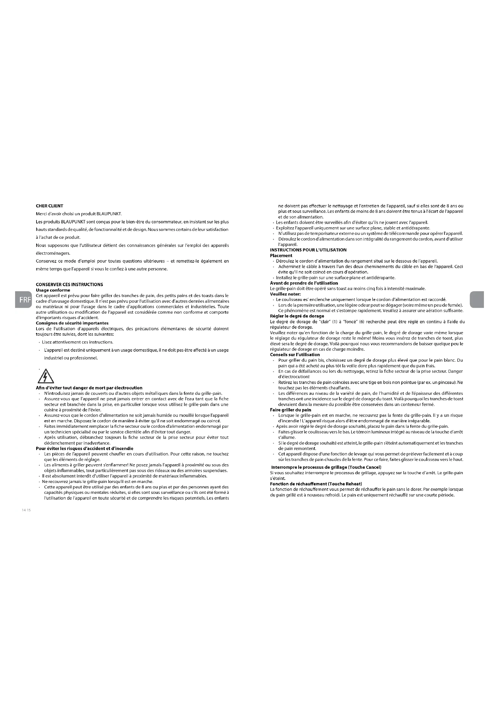 - Cet appareil dispose d’une fonction de levage qui vous permet de prélever facilement et à coup sûr les tranches de pain chaudes de la fente. Pour ce faire, faites glisser le coulisseau vers le haut. Interrompre le processus de grillage (Touche Cancel) Si vous souhaitez interrompre le processus de grillage, appuyez sur la touche d’arrêt. Le grille-pain s’éteint. Fonction de réchauement (Touche Reheat) La fonction de réchauement vous permet de réchauer le pain sans le dorer. Par exemple lorsque du pain grillé est à nouveau refroidi. Le pain est uniquement réchaué sur une courte période.16 17 FR FR