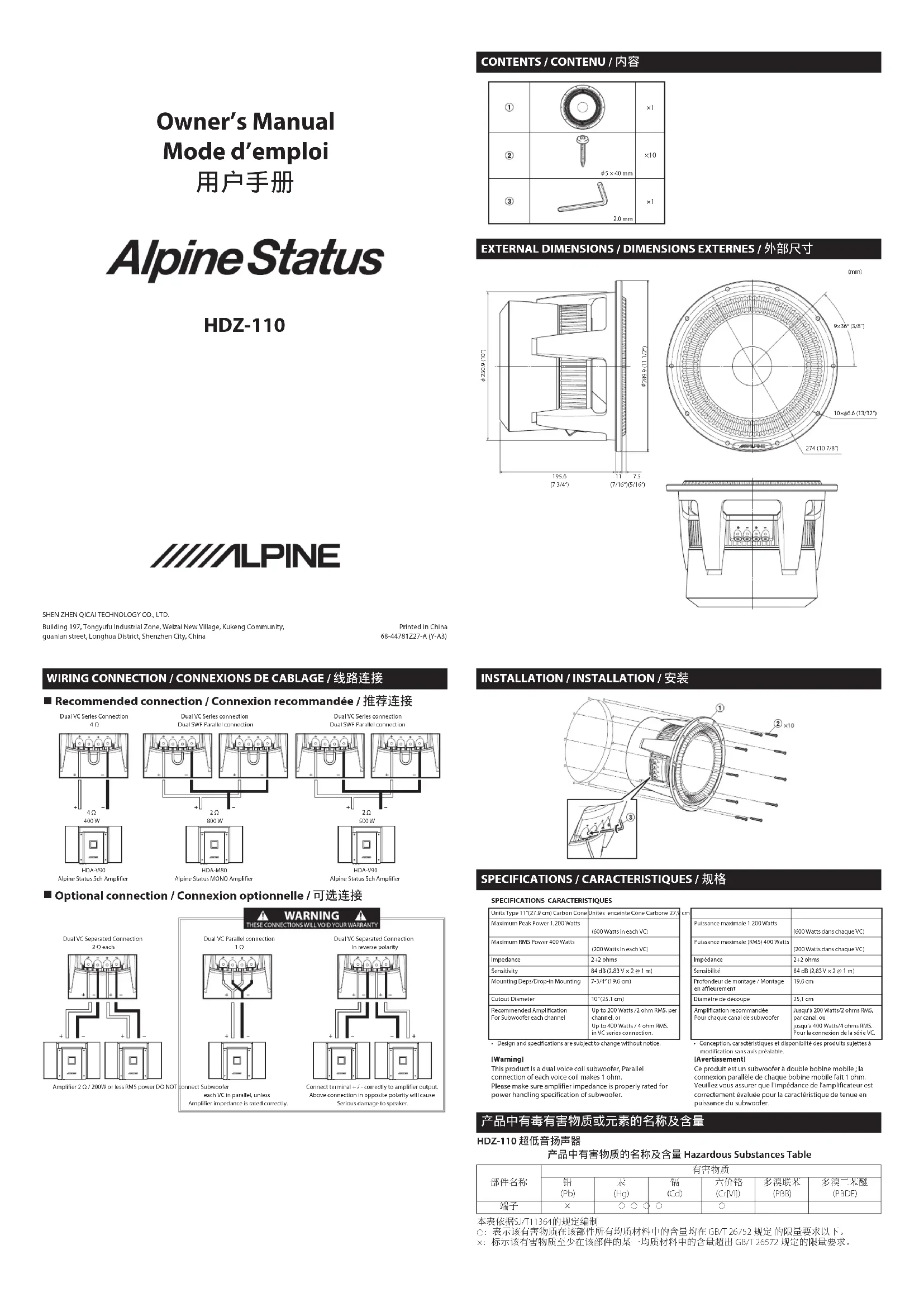- Design and specifications are subject to change without notice. • Conception, caractéristiques et disponibilté des produits sujettes á modification sans avis préalable.[Warning]This product is a dual voice coil subwoofer, Parallel connection of each voice coil makes 1 ohm.Please make sure amplifier impedance is properly rated for power handling specification of subwoofer. [Avertissement]Ce produit est un subwoofer à double bobine mobile ; la connexion parallèle de chaque bobine mobile fait 1 ohm.Veuillez vous assurer que l’impédance de l’amplificateur est correctement évaluée pour la caractéristique de tenue en puissance du subwoofer. 产品中有毒有害物质或元素的名称及含量 HDZ-110 超低音扬声器 产品中有害物质的名称及含量 Hazardous Substances Table