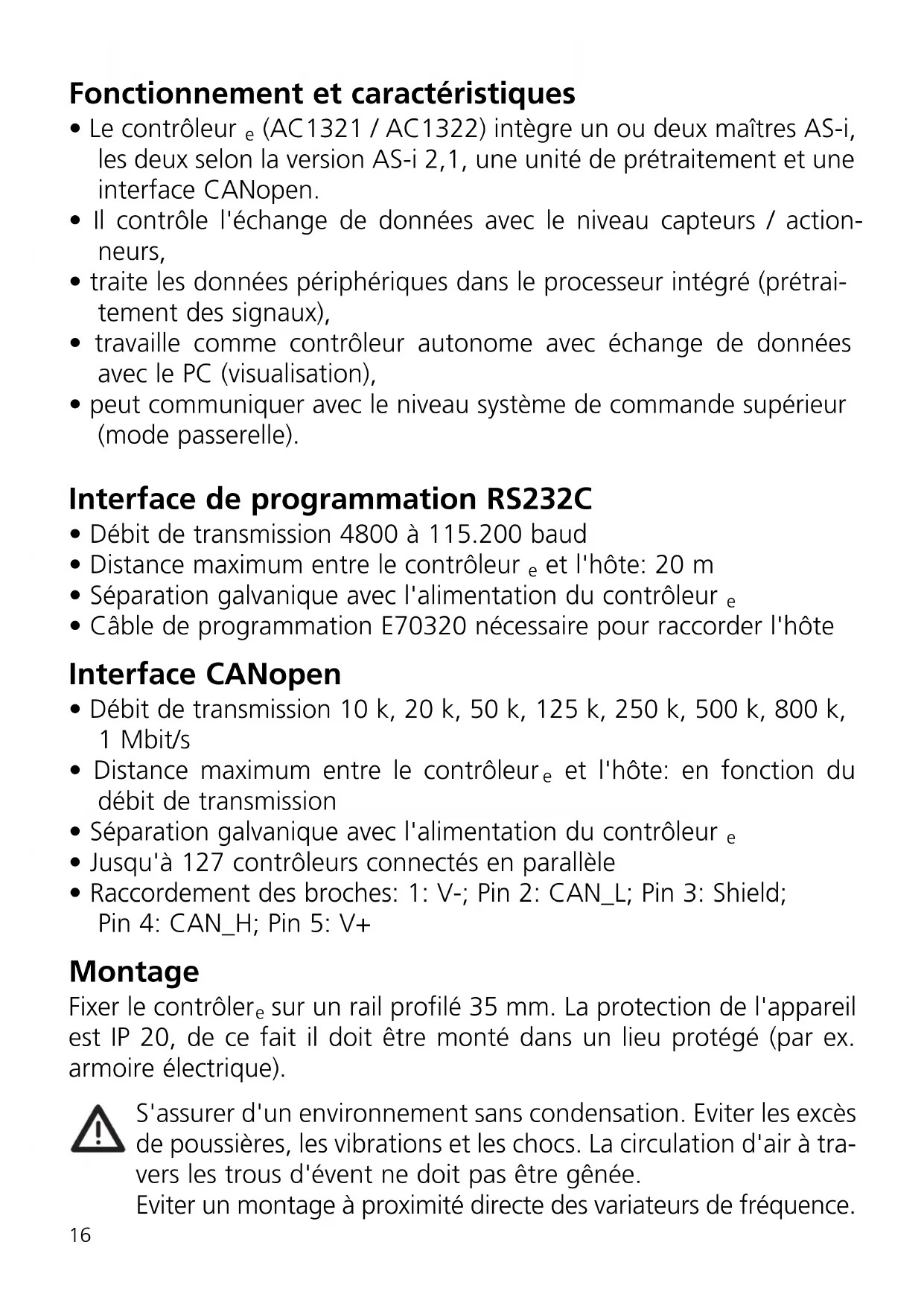 état réseauétat module réservé power CANopen Voyants LED et raccordement des bornes Interface CANopen affichage boutons seulement AC1322Réglage du contraste Le contraste peut être modifié directement en appuyant simultanément sur le bouton droit et le bouton Δ (trop clair) ou le bouton ∇ (trop foncé). Fonctionnement Pour le fonctionnement d'un système AS-i une alimentation AS-i spécifique est nécessaire. Le raccordement se fait aux bornes AS-i + et AS-i -. Déconnecter l'alimentation avant de raccorder le contrôleure. Le systè- me AS-i fonctionne sans mise à la terre. AS-i + et AS-i - doivent être symétriques par rapport à la masse de l'installation. S'assurer que le raccordement du point de symétrie de l'alimentation AS-i (borne „shield“) à la masse de l'installation est de faible rési- stance.