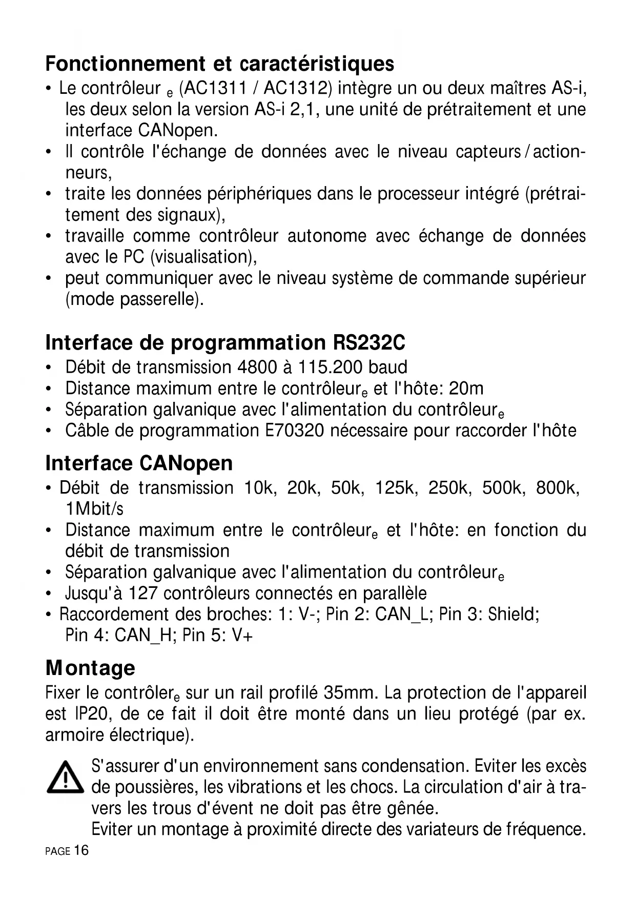 état réseauétat module réservé power CANopen Voyants LED et raccordement des bornes Interface CANopen affichage boutons seulement AC1312Réglage du contraste Le contraste peut être modifié directement en appuyant simultanément sur le bouton droit et le bouton ∆ (trop clair) ou le bouton ∇ (trop foncé). Fonctionnement Pour le fonctionnement d'un système AS-i une alimentation AS-i spé- cifique est nécessaire. Le raccordement se fait aux bornes AS-i + et AS-i -. Déconnecter l'alimentation avant de raccorder le contrôleur