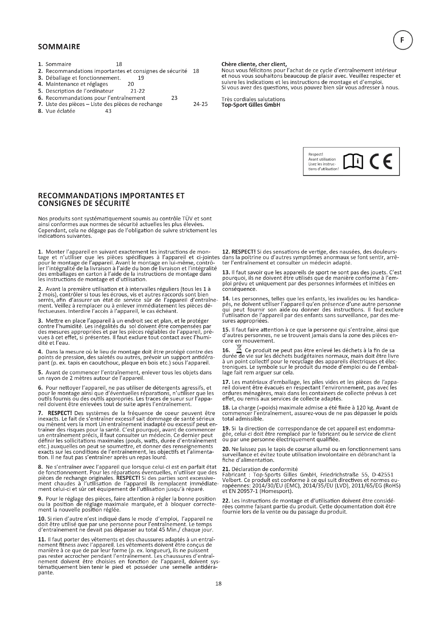 Chère cliente, cher client, Nous vous félicitons pour l’achat de ce cycle d’entraînement intérieur et nous vous souhaitons beaucoup de plaisir avec. Veuillez respecter et suivre les indicaons et les instrucons de montage et d’emploi. Si vous avez des quesons, vous pouvez bien sûr vous adresser à nous. Très cordiales salutaons Top-Sport Gilles GmbH Nos produits sont systémaquement soumis au contrôle TÜV et sont ainsi conformes aux normes de sécurité actuelles les plus élevées. Cependant, cela ne dégage pas de l’obligaon de suivre strictement les indicaons suivantes. Respect! Avant ulisaon Lisez les instruc- ons d’ulisaon!