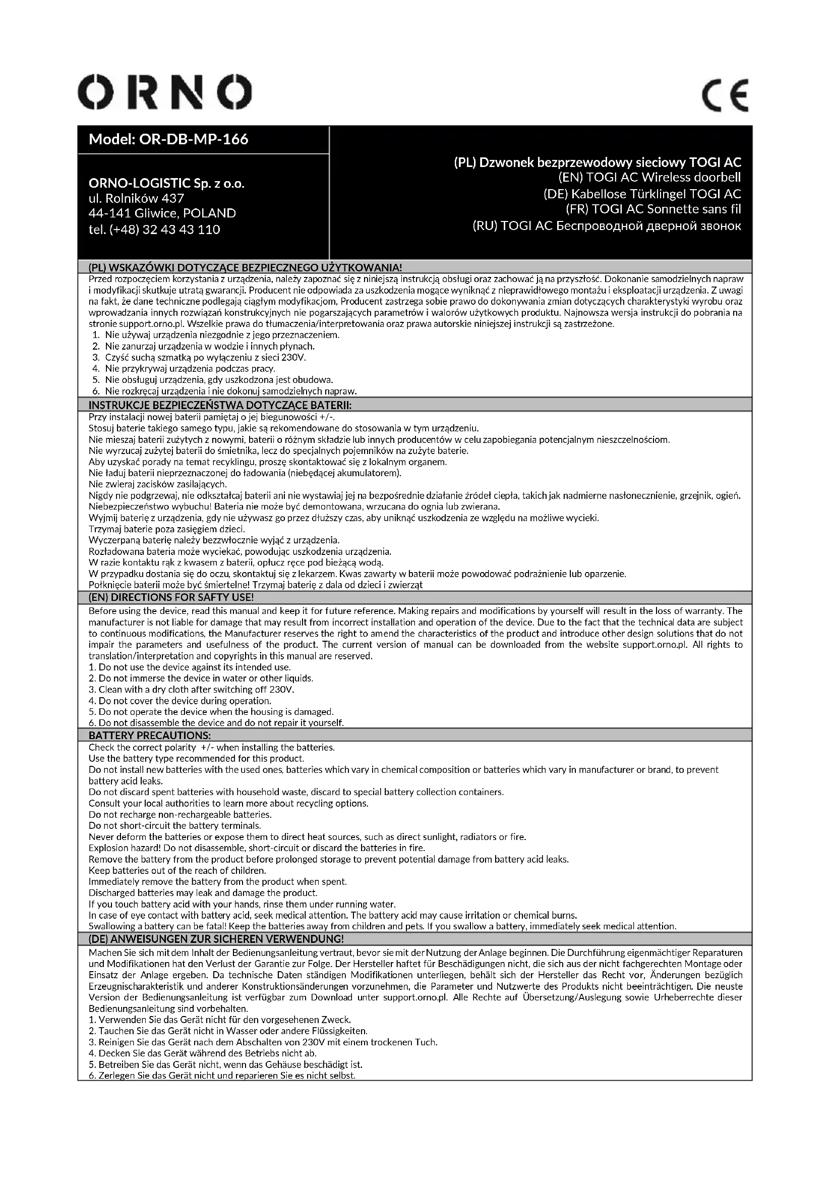 CONSIGNES DE SÉCURITÉ DE LA PILE: Lorsque vous installez une nouvelle pile, n'oubliez pas sa polarité +/-. Utilisez des piles du même type que celles recommandées pour cet appareil. Ne mélangez pas des piles usagées avec des piles neuves, des piles de composition différente ou des piles de différents fabricants pour éviter les fuites potentielles. Ne jetez pas les piles usagées directement dans la poubelle, uniquement dans des conteneurs spéciaux. Contactez votre autorité locale pour obtenir des conseils sur le recyclage. Ne chargez pas une pile non rechargeable. Ne court-circuitez pas les bornes d'alimentation. Ne jamais chauffer, déformer ou exposer la piles à des sources de chaleur directes telles qu'un ensoleillement excessif, un radiateur ou un feu. Risque d'explosion ! La pile ne doit pas être démontée, jetée dans un feu ou court-circuitée. Retirez la pile de l'appareil lorsque vous ne l'utilisez pas pendant une longue période afin d'éviter tout dommage dû à une éventuelle fuite. Tenez les piles hors de la portée des enfants. Une pile déchargée doit être immédiatement retirée de l'appareil. Une pile déchargée peut fuir et endommager l'appareil. Si vos mains entrent en contact avec l'acide de la pire, rincez-les sous l'eau courante. En cas de contact avec les yeux, contactez un médecin. L'acide contenu dans la pile peut provoquer des irritations ou des brûlures. Avaler des piles peut être fatal ! Tenir à l'écart des enfants et des animaux. (RU) СОВЕТЫ ПО БЕЗОПАСНОМУ ИСПОЛЬЗОВАНИЮ! Перед началом использования устройства необходимо изучить настоящую инструкцию по эксплуатации и сохранить ее для будущего использования. Самостоятельный ремонт и модификация приводят к потере гарантии. Производитель не несет ответственности за повреждения, которые могут возникнуть из-за неправильного монтажа или эксплуатации устройства. Ввиду постоянных модификаций технических данных Производитель оставляет за собой право вносить изменения в описание изделия и вносить прочие конструкционные изменения, не влияющие отрицательно на параметры и эксплуатационные качества изделия. Последняя версия инструкции доступна для скачивания на сайте support.orno.pl. Все права на перевод/интерпретацию и авторские права настоящей инструкции защищены.