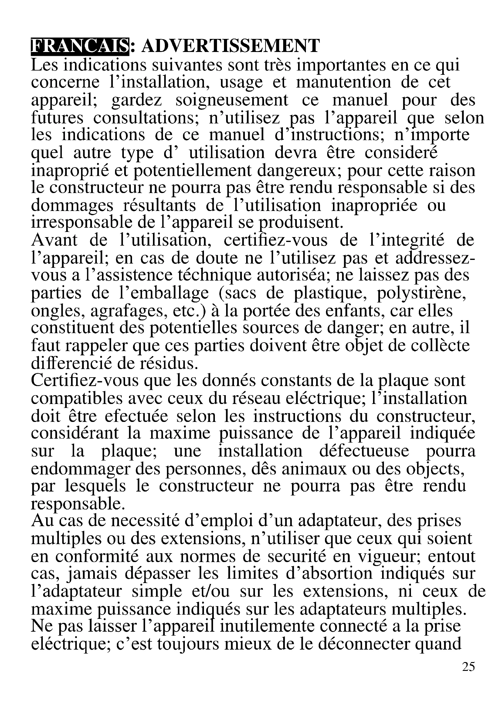 - Luftaustrittsöffnung25 FRANCAIS: ADVERTISSEMENT Les indications suivantes sont très importantes en ce qui concerne l’installation, usage et manutention de cet appareil; gardez soigneusement ce manuel pour des futures consultations; n’utilisez pas l’appareil que selon les indications de ce manuel d’instructions; n’importe quel autre type d’ utilisation devra être consideré inaproprié et potentiellement dangereux; pour cette raison le constructeur ne pourra pas être rendu responsable si des dommages résultants de l’utilisation inapropriée ou irresponsable de l’appareil se produisent. Avant de l’utilisation, certifiez-vous de l’integrité de l’appareil; en cas de doute ne l’utilisez pas et addressez- vous a l’assistence téchnique autoriséa; ne laissez pas des parties de l’emballage (sacs de plastique, polystirène, ongles, agrafages, etc.) à la portée des enfants, car elles constituent des potentielles sources de danger; en autre, il faut rappeler que ces parties doivent être objet de collècte differencié de résidus. Certifiez-vous que les donnés constants de la plaque sont compatibles avec ceux du réseau eléctrique; l’installation doit être efectuée selon les instructions du constructeur, considérant la maxime puissance de l’appareil indiquée sur la plaque; une installation défectueuse pourra endommager des personnes, dês animaux ou des objects, par lesquels le constructeur ne pourra pas être rendu responsable. Au cas de necessité d’emploi d’un adaptateur, des prises multiples ou des extensions, n’utiliser que ceux qui soient en conformité aux normes de securité en vigueur; entout cas, jamais dépasser les limites d’absortion indiqués sur l’adaptateur simple et/ou sur les extensions, ni ceux de maxime puissance indiqués sur les adaptateurs multiples. Ne pas laisser l’appareil inutilemente connecté a la prise eléctrique; c’est toujours mieux de le déconnecter quand26 il n’est pas à l’use. Débranchez toujours l'appareil de l'alimentation électrique s'il est laissé sans surveillance. Pour le nettoyage déconnectez la fiche du secteur électrique. Quand l’appareil soit hors usage et ait été décidé qu’il ne sera pas reparé, on reccomande son inutilisation, en coupant son câble d’alimentation. Ne pas approcher le câble d’alimentation d’objects coupants ou de surfaces chaudes, et ne pas tirer sur le cordon d’alimentation pour le débrancher de la prise. Ne le laissez pas pendre du plan de travail où un enfant pourrait le tenir. Ne pas utiliser l’appareil si le câble d’alimentation ou la fiche de connéction eléctrique sont endommagés, ou encore en cas de court-circuits; dans ce cas là, apporter l’appareil a un centre d’assistence autorisé. L’appareil n’est pas indiqué pour être exposé à des conditions météorologiques défavorables (pluie, vent, humidité, la glace, etc.); Gardez-le dans un endroit sec. Jamais opérer ou même toucher l’appareil avec les mains mouillées ou les pieds nus. Cet appareil peut être utilisé par des enfants agés de plus de 8 ans et par des personnes avec une réduite capacité phisique, sensorial ou mental, ou encore avec peu d’expérience à son usage, pourvu qu’une supervision adéquate leur en soit assuré, ou s’ils auraient été instruits à l’usage de l’appareil en complete securité. Les opérations de nettoyage e de manutention ne oivent pás être efectués par des enfants, sauf pour ceux qui sont agés de plus de 8 ans et sont supervisionés. Les enfants ne doivent pas jouer avec cet appareil. Gardez l’appareil et le câble d’alimentation hors la portée des enfants agés de moins de 8 ans. Si le câble d'alimentation est endommagé ou en cas de27 panne et / ou de dysfonctionnement, ne modifiez pas l'appareil. Toute réparation doit être effectuée par le fabricant ou par son service d'assistance technique ou, en tout cas, par une personne possédant une qualification similaire, afin d'éviter tout risque. Le non-respect de ce qui précède peut compromettre la sécurité de l'appareil et invalider les conditions de la garantie. ATTENTION: Cet appareil comporte une fonction de chauffage. Quelques surfaces, même si non la plaque elle même, pourront atteindre des températures élevées. Étant donné que la sensibilité à la température diffère de personne à personne, cet appareil devrà être usé avec PRUDENCE. Placez l’appareil sur des surfaces adéhrentes et préparées pour cet effet, et utilisez les mésures de protection contre la chaleur conseillées. Cet appareil est destiné à être utilisé dans les ménages et des applications similaires: les cuisines du personnel dans les magasins, bureaux et autres environnements de travail, pour les clients dans les hôtels, motels et autres environnements de type résidentiel, de type lit et petit- déjeuner, hébergement. L’appareil n’est pas conçu pour être utilisé avec une minuterie extérieure ou un commande à distance. N’utiliser que des accéssoires e pièces d’origine. Avant chaque utilisation, effectuez le cordon d'alimentation. Ne soumettez pas le produit à des chocs susceptibles de l'endommager. Tenir l’appareil à l’écart des environnements où il peut y avoir des gaz, vapeurs, des substances inflammables ou explosives.