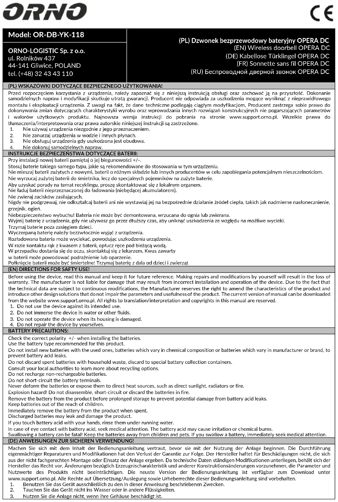 CONSIGNES DE SÉCURITÉ DE LA PILE: Lorsque vous installez une nouvelle pile, n'oubliez pas sa polarité +/-. Utilisez des piles du même type que celles recommandées pour cet appareil. Ne mélangez pas des piles usagées avec des piles neuves, des piles de composition différente ou des piles de différents fabricants pour éviter les fuites potentielles. Ne jetez pas les piles usagées directement dans la poubelle, uniquement dans des conteneurs spéciaux. Contactez votre autorité locale pour obtenir des conseils sur le recyclage. Ne chargez pas une pile non rechargeable. Ne court-circuitez pas les bornes d'alimentation. Ne jamais chauffer, déformer ou exposer la piles à des sources de chaleur directes telles qu'un ensoleillement excessif, un radiateur ou un feu. Risque d'explosion ! La pile ne doit pas être démontée, jetée dans un feu ou court-circuitée. Retirez la pile de l'appareil lorsque vous ne l'utilisez pas pendant une longue période afin d'éviter tout dommage dû à une éventuelle fuite. Tenez les piles hors de la portée des enfants. Une pile déchargée doit être immédiatement retirée de l'appareil. Une pile déchargée peut fuir et endommager l'appareil. Si vos mains entrent en contact avec l'acide de la pire, rincez-les sous l'eau courante. En cas de contact avec les yeux, contactez un médecin. L'acide contenu dans la pile peut provoquer des irritations ou des brûlures. Avaler des piles peut être fatal ! Tenir à l'écart des enfants et des animaux. (RU) СОВЕТЫ ПО БЕЗОПАСНОМУ ИСПОЛЬЗОВАНИЮ! Перед началом использования устройства необходимо изучить настоящую инструкцию по эксплуатации и сохранить ее для будущего использования. Самостоятельный ремонт и модификация приводят к потере гарантии. Производитель не несет ответственности за повреждения, которые могут возникнуть из-за неправильного монтажа или эксплуатации устройства. Ввиду постоянных модификаций технических данных Производитель оставляет за собой право вносить изменения в описание изделия и вносить прочие конструкционные изменения, не влияющие отрицательно на параметры и эксплуатационные качества изделия. Последняя версия инструкции доступна для скачивания на сайте www.support.orno.pl. Все права на перевод/интерпретацию и авторские права настоящей инструкции защищены.