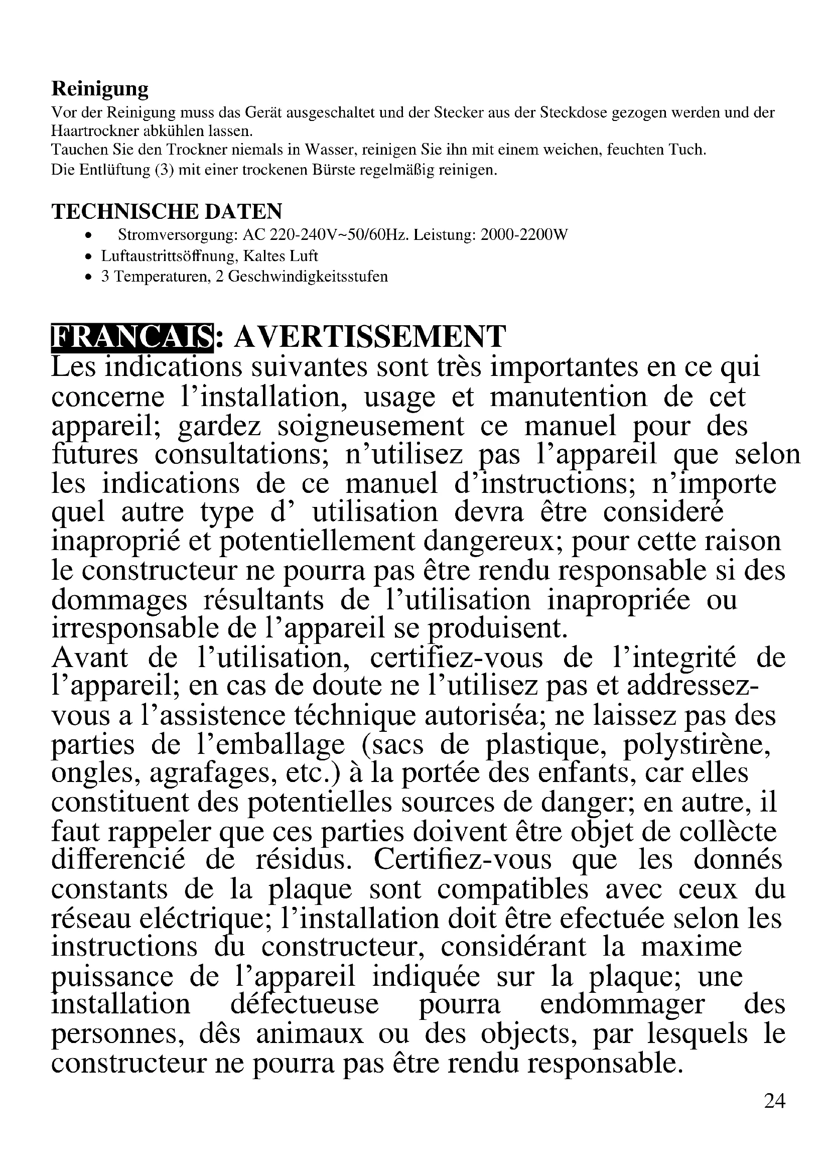 - Alimentantion: AC 220-240V~50/60Hz. Puissance: 2000-2200W