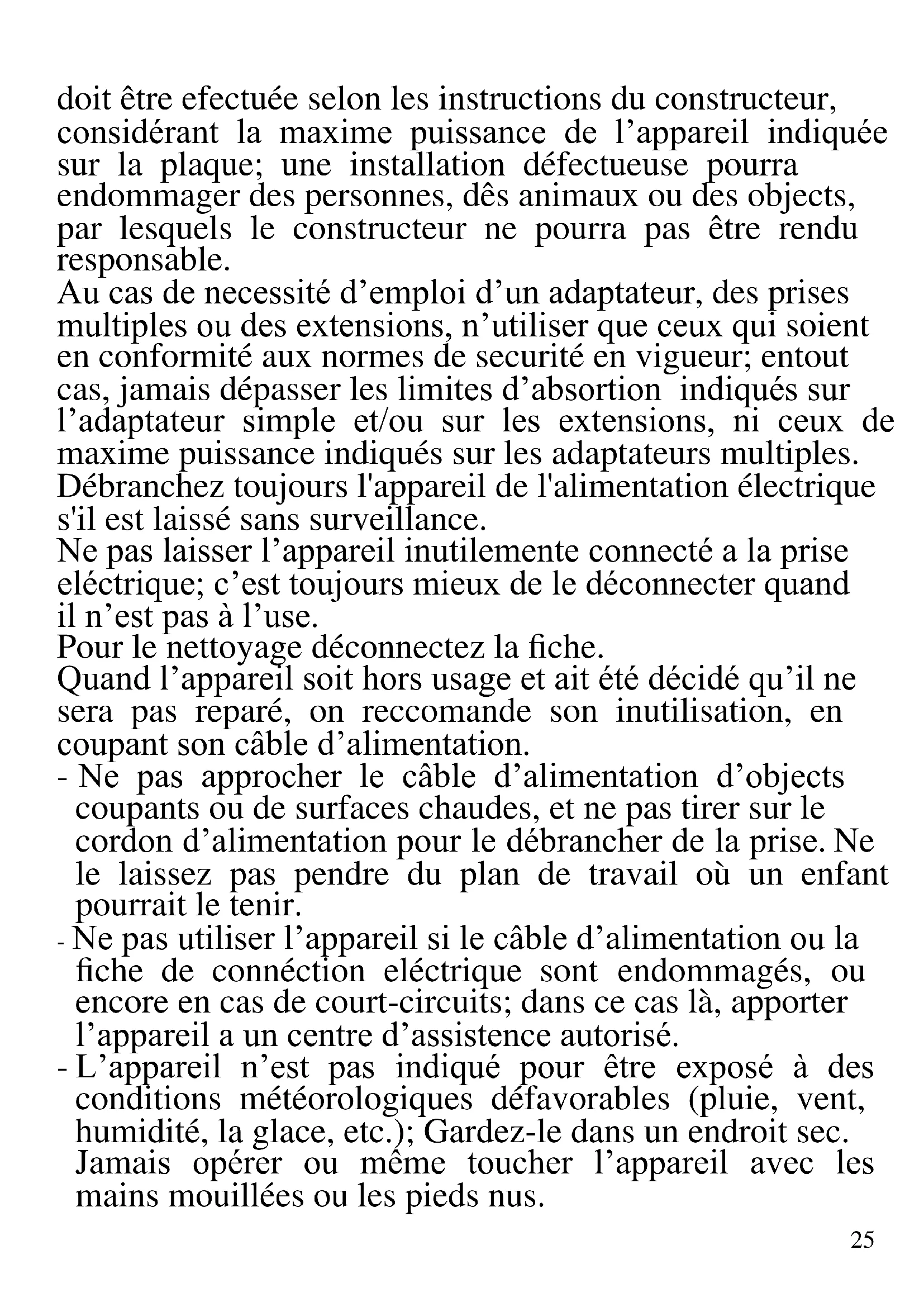 FRANCAIS: ADVERTISSEMENT Les indications suivantes sont très importantes en ce qui concerne l’installation, usage et manutention de cet appareil; gardez soigneusement ce manuel pour des futures consultations; n’utilisez pas l’appareil que selon les indications de ce manuel d’instructions; n’importe quel autre type d’ utilisation devra être consideré inaproprié et potentiellement dangereux; pour cette raison le constructeur ne pourra pas être rendu responsable si des dommages résultants de l’utilisation inapropriée ou irresponsable de l’appareil se produisent. Avant de l’utilisation, certifiez-vous de l’integrité de l’appareil; en cas de doute ne l’utilisez pas et addressez- vous a l’assistence téchnique autoriséa; ne laissez pas des parties de l’emballage (sacs de plastique, polystirène, ongles, agrafages, etc.) à la portée des enfants, car elles constituent des potentielles sources de danger; en autre, il faut rappeler que ces parties doivent être objet de collècte differencié de résidus. Certifiez-vous que les donnés constants de la plaque sont compatibles avec ceux du réseau eléctrique; l’installation25 doit être efectuée selon les instructions du constructeur, considérant la maxime puissance de l’appareil indiquée sur la plaque; une installation défectueuse pourra endommager des personnes, dês animaux ou des objects, par lesquels le constructeur ne pourra pas être rendu responsable. Au cas de necessité d’emploi d’un adaptateur, des prises multiples ou des extensions, n’utiliser que ceux qui soient en conformité aux normes de securité en vigueur; entout cas, jamais dépasser les limites d’absortion indiqués sur l’adaptateur simple et/ou sur les extensions, ni ceux de maxime puissance indiqués sur les adaptateurs multiples. Débranchez toujours l'appareil de l'alimentation électrique s'il est laissé sans surveillance. Ne pas laisser l’appareil inutilemente connecté a la prise eléctrique; c’est toujours mieux de le déconnecter quand il n’est pas à l’use. Pour le nettoyage déconnectez la fiche. Quand l’appareil soit hors usage et ait été décidé qu’il ne sera pas reparé, on reccomande son inutilisation, en coupant son câble d’alimentation. - Ne pas approcher le câble d’alimentation d’objects coupants ou de surfaces chaudes, et ne pas tirer sur le cordon d’alimentation pour le débrancher de la prise. Ne le laissez pas pendre du plan de travail où un enfant pourrait le tenir. - Ne pas utiliser l’appareil si le câble d’alimentation ou la fiche de connéction eléctrique sont endommagés, ou encore en cas de court-circuits; dans ce cas là, apporter l’appareil a un centre d’assistence autorisé. - L’appareil n’est pas indiqué pour être exposé à des conditions météorologiques défavorables (pluie, vent, humidité, la glace, etc.); Gardez-le dans un endroit sec. Jamais opérer ou même toucher l’appareil avec les mains mouillées ou les pieds nus.26 - Les enfants ne doivent pas jouer avec cet appareil. - Cet appareil peut être utilisé par des enfants agés de plus de 8 ans et par des personnes avec une réduite capacité phisique, sensorial ou mental, ou encore avec peu d’expérience à son usage, pourvu qu’une supervision adéquate leur en soit assuré, ou s’ils auraient été instruits à l’usage de l’appareil en complete securité. Les opérations de nettoyage e de manutention ne oivent pás être efectués par des enfants, sauf pour ceux qui sont agés de plus de 8 ans et sont supervisionés. - Gardez l’appareil et le câble d’alimentation hors la portée des enfants agés de moins de 8 ans. Si le câble d'alimentation est endommagé ou en cas de panne et / ou de dysfonctionnement, ne modifiez pas l'appareil. Toute réparation doit être effectuée par le fabricant ou par son service d'assistance technique ou, en tout cas, par une personne possédant une qualification similaire, afin d'éviter tout risque. Le non-respect de ce qui précède peut compromettre la sécurité de l'appareil et invalider les conditions de la garantie. ATTENTION: Cet appareil comporte une fonction de chauffage. Ne pas couvrir. Gardez de l'espace sur les côtés lors de l'utilisation. Quelques surfaces, même si non la plaque elle même, pourront atteindre des températures élevées. Étant donné que la sensibilité à la température diffère de personne à personne, cet appareil devrà être usé avec PRUDENCE. Placez l’appareil sur des surfaces adéhrentes et préparées pour cet effet, et utilisez les mésures de protection contre la chaleur conseillées. - Cet appareil est destiné à être utilisé dans les ménages et des applications similaires: les cuisines du personnel dans les magasins, bureaux et autres environnements de travail, pour les clients dans les hôtels, motels et autres environnements de type résidentiel, de type lit et petit- déjeuner, hébergement.27 - N’utiliser que des accéssoires e pièces d’origine. - Avant chaque utilisation, effectuez le cordon d'alimentation. Ne soumettez pas le produit à des chocs susceptibles de l'endommager. - L’appareil n’est pas conçu pour être utilisé avec une minuterie extérieure ou un commande à distance. Tenir l’appareil à l’écart des environnements où il peut y avoir des gaz, vapeurs, des substances inflammables ou explosives.