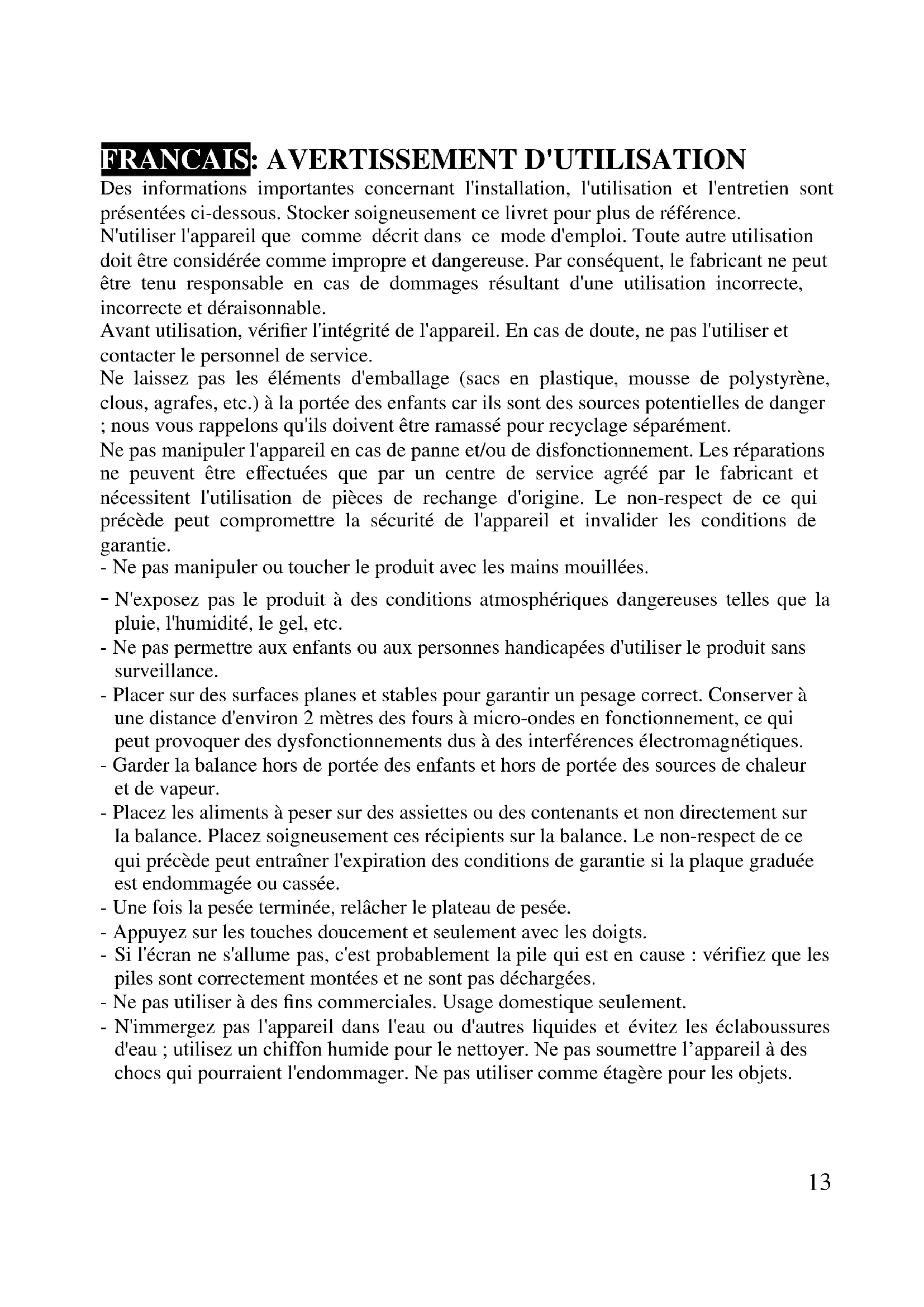 Des informations importantes concernant l'installation, l'utilisation et l'entretien sont présentées ci-dessous. Stocker soigneusement ce livret pour plus de référence. N'utiliser l'appareil que comme décrit dans ce mode d'emploi. Toute autre utilisation doit être considérée comme impropre et dangereuse. Par conséquent, le fabricant ne peut être tenu responsable en cas de dommages résultant d'une utilisation incorrecte, incorrecte et déraisonnable. Avant utilisation, vérifier l'intégrité de l'appareil. En cas de doute, ne pas l'utiliser et contacter le personnel de service. Ne laissez pas les éléments d'emballage (sacs en plastique, mousse de polystyrène, clous, agrafes, etc.) à la portée des enfants car ils sont des sources potentielles de danger ; nous vous rappelons qu'ils doivent être ramassé pour recyclage séparément. Ne pas manipuler l'appareil en cas de panne et/ou de disfonctionnement. Les réparations ne peuvent être effectuées que par un centre de service agréé par le fabricant et nécessitent l'utilisation de pièces de rechange d'origine. Le non-respect de ce qui précède peut compromettre la sécurité de l'appareil et invalider les conditions de garantie. - Ne pas manipuler ou toucher le produit avec les mains mouillées. - N'exposez pas le produit à des conditions atmosphériques dangereuses telles que la pluie, l'humidité, le gel, etc. - Ne pas permettre aux enfants ou aux personnes handicapées d'utiliser le produit sans surveillance. - Placer sur des surfaces planes et stables pour garantir un pesage correct. Conserver à une distance d'environ 2 mètres des fours à micro-ondes en fonctionnement, ce qui peut provoquer des dysfonctionnements dus à des interférences électromagnétiques. - Garder la balance hors de portée des enfants et hors de portée des sources de chaleur et de vapeur. - Placez les aliments à peser sur des assiettes ou des contenants et non directement sur la balance. Placez soigneusement ces récipients sur la balance. Le non-respect de ce qui précède peut entraîner l'expiration des conditions de garantie si la plaque graduée est endommagée ou cassée. - Une fois la pesée terminée, relâcher le plateau de pesée. - Appuyez sur les touches doucement et seulement avec les doigts. - Si l'écran ne s'allume pas, c'est probablement la pile qui est en cause : vérifiez que les piles sont correctement montées et ne sont pas déchargées. - Ne pas utiliser à des fins commerciales. Usage domestique seulement. - N'immergez pas l'appareil dans l'eau ou d'autres liquides et évitez les éclaboussures d'eau ; utilisez un chiffon humide pour le nettoyer. Ne pas soumettre l’appareil à des chocs qui pourraient l'endommager. Ne pas utiliser comme étagère pour les objets.14
