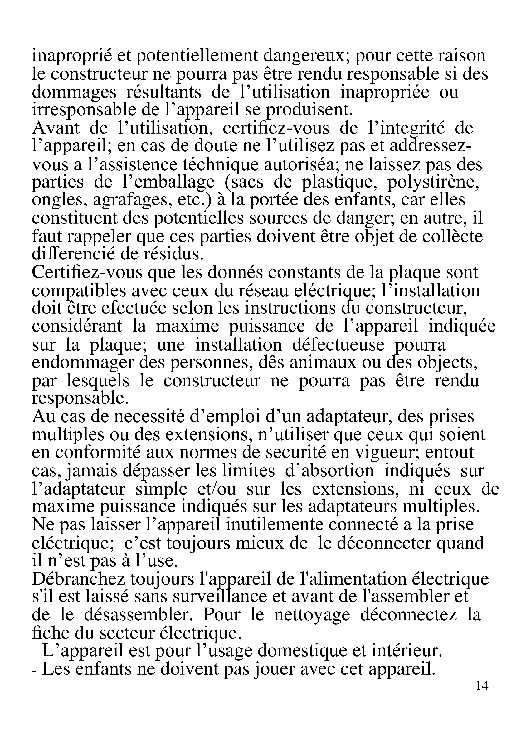 FRANCAIS: AVERTISSEMENT Les indications suivantes sont très importantes en ce qui concerne l’installation, usage et manutention de cet appareil; gardez soigneusement ce manuel pour des futures consultations; n’utilisez pas l’appareil que selon les indications de ce manuel d’instructions; n’importe quel autre type d’ utilisation devra être consideré14 inaproprié et potentiellement dangereux; pour cette raison le constructeur ne pourra pas être rendu responsable si des dommages résultants de l’utilisation inapropriée ou irresponsable de l’appareil se produisent. Avant de l’utilisation, certifiez-vous de l’integrité de l’appareil; en cas de doute ne l’utilisez pas et addressez- vous a l’assistence téchnique autoriséa; ne laissez pas des parties de l’emballage (sacs de plastique, polystirène, ongles, agrafages, etc.) à la portée des enfants, car elles constituent des potentielles sources de danger; en autre, il faut rappeler que ces parties doivent être objet de collècte differencié de résidus. Certifiez-vous que les donnés constants de la plaque sont compatibles avec ceux du réseau eléctrique; l’installation doit être efectuée selon les instructions du constructeur, considérant la maxime puissance de l’appareil indiquée sur la plaque; une installation défectueuse pourra endommager des personnes, dês animaux ou des objects, par lesquels le constructeur ne pourra pas être rendu responsable. Au cas de necessité d’emploi d’un adaptateur, des prises multiples ou des extensions, n’utiliser que ceux qui soient en conformité aux normes de securité en vigueur; entout cas, jamais dépasser les limites d’absortion indiqués sur l’adaptateur simple et/ou sur les extensions, ni ceux de maxime puissance indiqués sur les adaptateurs multiples. Ne pas laisser l’appareil inutilemente connecté a la prise eléctrique; c’est toujours mieux de le déconnecter quand il n’est pas à l’use. Débranchez toujours l'appareil de l'alimentation électrique s'il est laissé sans surveillance et avant de l'assembler et de le désassembler. Pour le nettoyage déconnectez la fiche du secteur électrique. - L’appareil est pour l’usage domestique et intérieur. - Les enfants ne doivent pas jouer avec cet appareil.15 Quand l’appareil soit hors usage et ait été décidé qu’il ne sera pas reparé, on reccomande son inutilisation, en coupant son câble d’alimentation. - Ne pas approcher le câble d’alimentation d’objects coupants ou de surfaces chaudes, et ne pas tirer sur le cordon d’alimentation pour le débrancher de la prise. Ne le laissez pas pendre du plan de travail où un enfant pourrait le tenir. - Ne pas utiliser l’appareil si le câble d’alimentation ou la fiche de connéction eléctrique sont endommagés, ou encore en cas de court-circuits; dans ce cas là, apporter l’appareil a un centre d’assistence autorisé. - L’appareil n’est pas indiqué pour être exposé à des conditions météorologiques défavorables (pluie, vent, humidité, la glace, etc.); Gardez-le dans un endroit sec. Jamais opérer ou même toucher l’appareil avec les mains mouillées ou les pieds nus. - Cet appareil peut être utilisé par des enfants agés de plus de 8 ans et par des personnes avec une réduite capacité phisique, sensorial ou mental, ou encore avec peu d’expérience à son usage, pourvu qu’une supervision adéquate leur en soit assuré, ou s’ils auraient été instruits à l’usage de l’appareil en complete securité. Les opérations de nettoyage e de manutention ne oivent pás être efectués par des enfants, sauf pour ceux qui sont agés de plus de 8 ans et sont supervisionés. - Gardez l’appareil et le câble d’alimentation hors la portée des enfants agés de moins de 8 ans. - Cet appareil peut être utilisé par des personnes ayant des capacités physiques, sensorielles ou mentales réduites, ou qui manquent d'expérience ou de connaissances, si elles ont été correctement supervisées ou ont reçu des instructions pour utiliser cet appareil en toute sécurité. Au cas de panne et/ou de mauvais fonctionnement, ne pas intervenir sur l’ appareil. Pour une éventuel réparation16 s’addresser uniquement a un centre autorisé par le constructeur, en demandant dês pièces de remplacement originaux. Le non respect de ces indications peut compromettre la securité de l’appareil e rendre invalides les termes de la garantie. - Cet appareil est destiné à être utilisé dans les ménages et des applications similaires: les cuisines du personnel dans les magasins, bureaux et autres environnements de travail, pour les clients dans les hôtels, motels et autres environnements de type résidentiel, de type lit et petit- déjeuner, hébergement. - L’appareil n’est pas conçu pour être utilisé avec une minuterie extérieure ou une commande à distance. - N’utiliser que des accéssoires e pièces d’origine. - Avant chaque utilisation, effectuez le cordon d'alimentation. Ne soumettez pas le produit à des chocs susceptibles de l'endommager. - Ne pas utiliser sous ou près des matériaux inflammables comme des rideaux, sources de chaleur, endroits froids et vapeur. Placer toujours les aliments à cuir dans le récipient afin d’éviter qu’ils touchent la partie chauffante. Ne pas couvrir les ouvertures de ventilation quand l’appareil est en fonction. Ne pas remplir le récipient avec de l’huile : risque d’incendie. Ne pas toucher la partie intérieure de l’appareil quand il est en fonction.