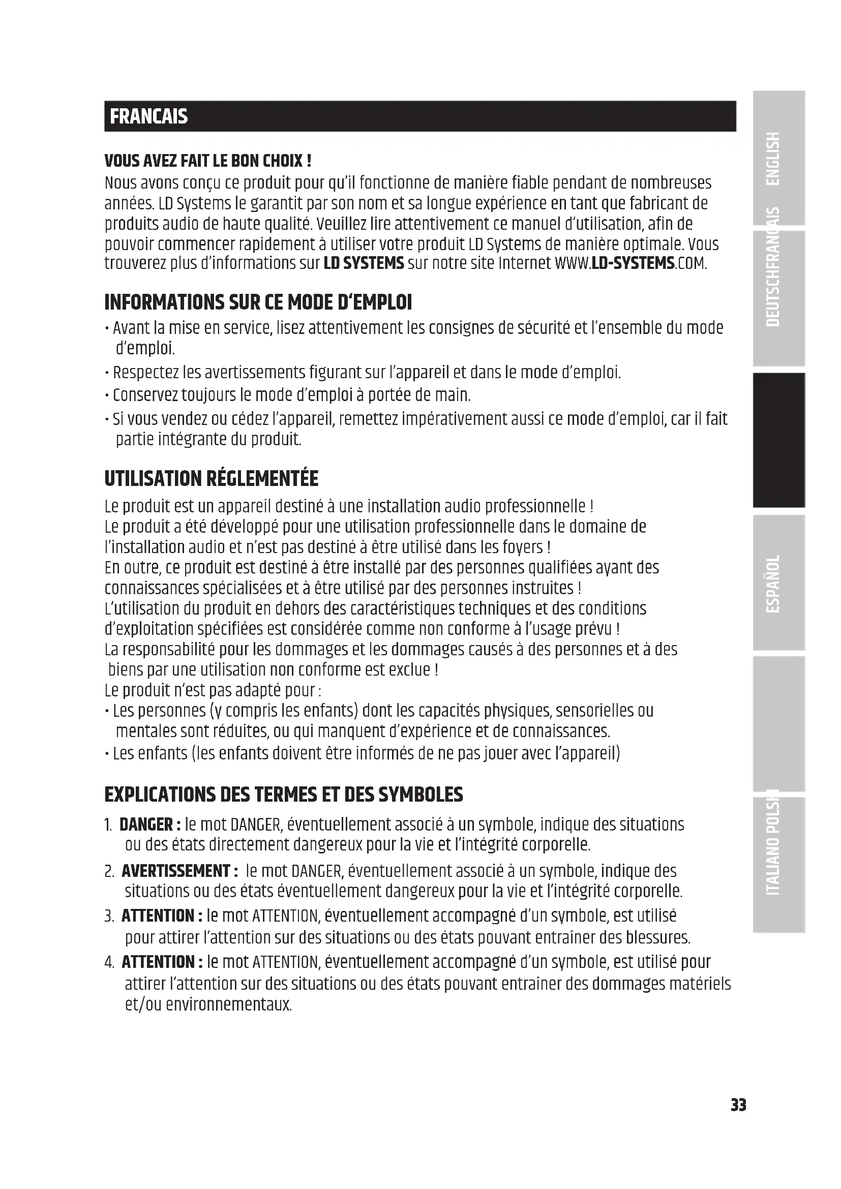 Le produit est un appareil destiné à une installation audio professionnelle ! Le produit a été développé pour une utilisation professionnelle dans le domaine de l’installation audio et n’est pas destiné à être utilisé dans les foyers ! En outre, ce produit est destiné à être installé par des personnes qualifiées ayant des connaissances spécialisées et à être utilisé par des personnes instruites ! L’utilisation du produit en dehors des caractéristiques techniques et des conditions d’exploitation spécifiées est considérée comme non conforme à l’usage prévu ! La responsabilité pour les dommages et les dommages causés à des personnes et à des biens par une utilisation non conforme est exclue ! Le produit n’est pas adapté pour :