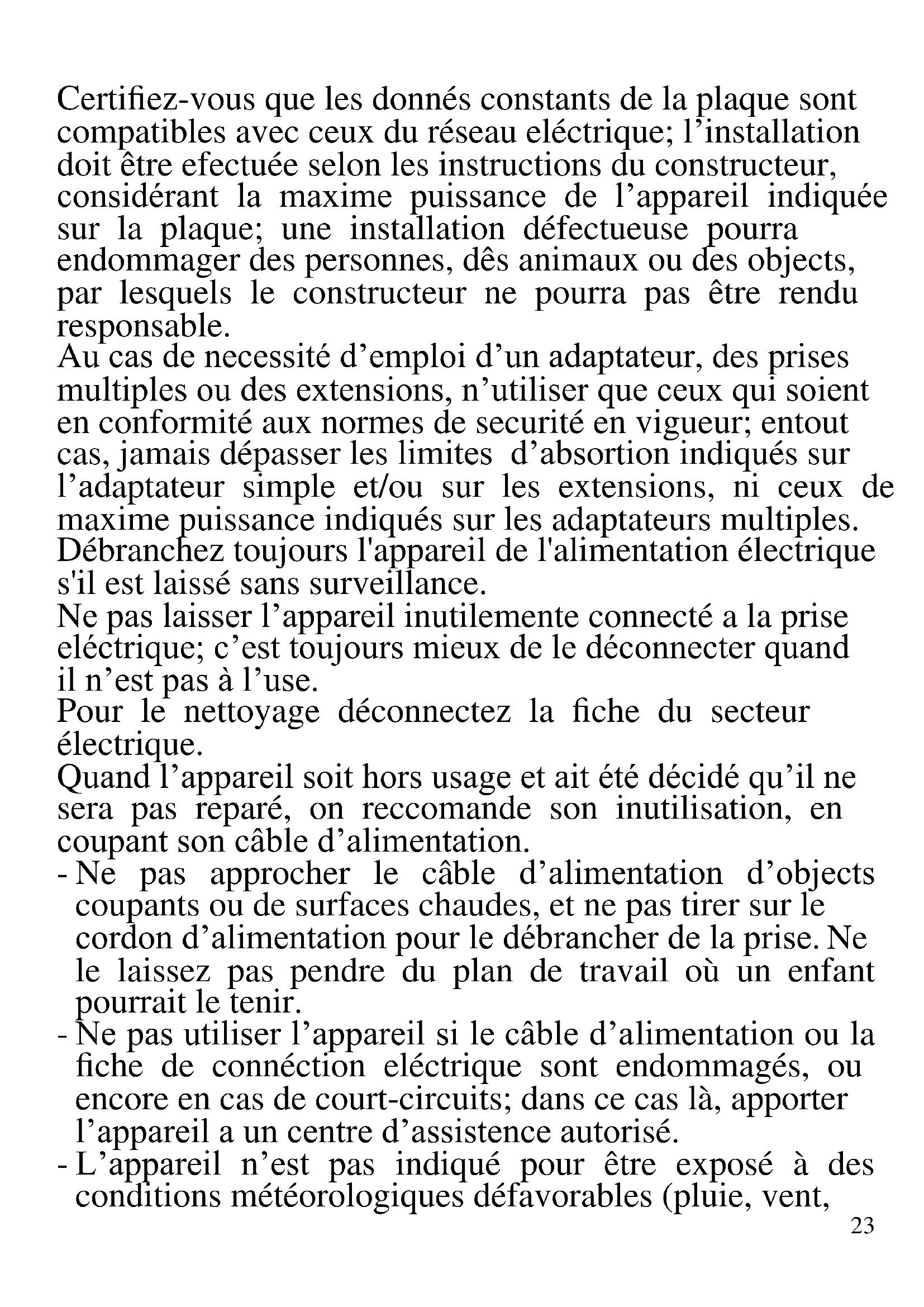 FRANCAIS: AVERTISSEMENT Les indications suivantes sont très importantes en ce qui concerne l’installation, usage et manutention de cet appareil; gardez soigneusement ce manuel pour des futures consultations; n’utilisez pas l’appareil que selon les indications de ce manuel d’instructions; n’importe quel autre type d’ utilisation devra être consideré inaproprié et potentiellement dangereux; pour cette raison le constructeur ne pourra pas être rendu responsable si des dommages résultants de l’utilisation inapropriée ou irresponsable de l’appareil se produisent. Avant de l’utilisation, certifiez-vous de l’integrité de l’appareil; en cas de doute ne l’utilisez pas et addressez- vous a l’assistence téchnique autoriséa; ne laissez pas des parties de l’emballage (sacs de plastique, polystirène, ongles, agrafages, etc.) à la portée des enfants, car elles constituent des potentielles sources de danger; en autre, il faut rappeler que ces parties doivent être objet de collècte differencié de résidus.23 Certifiez-vous que les donnés constants de la plaque sont compatibles avec ceux du réseau eléctrique; l’installation doit être efectuée selon les instructions du constructeur, considérant la maxime puissance de l’appareil indiquée sur la plaque; une installation défectueuse pourra endommager des personnes, dês animaux ou des objects, par lesquels le constructeur ne pourra pas être rendu responsable. Au cas de necessité d’emploi d’un adaptateur, des prises multiples ou des extensions, n’utiliser que ceux qui soient en conformité aux normes de securité en vigueur; entout cas, jamais dépasser les limites d’absortion indiqués sur l’adaptateur simple et/ou sur les extensions, ni ceux de maxime puissance indiqués sur les adaptateurs multiples. Débranchez toujours l'appareil de l'alimentation électrique s'il est laissé sans surveillance. Ne pas laisser l’appareil inutilemente connecté a la prise eléctrique; c’est toujours mieux de le déconnecter quand il n’est pas à l’use. Pour le nettoyage déconnectez la fiche du secteur électrique. Quand l’appareil soit hors usage et ait été décidé qu’il ne sera pas reparé, on reccomande son inutilisation, en coupant son câble d’alimentation. - Ne pas approcher le câble d’alimentation d’objects coupants ou de surfaces chaudes, et ne pas tirer sur le cordon d’alimentation pour le débrancher de la prise. Ne le laissez pas pendre du plan de travail où un enfant pourrait le tenir. - Ne pas utiliser l’appareil si le câble d’alimentation ou la fiche de connéction eléctrique sont endommagés, ou encore en cas de court-circuits; dans ce cas là, apporter l’appareil a un centre d’assistence autorisé. - L’appareil n’est pas indiqué pour être exposé à des conditions météorologiques défavorables (pluie, vent,24 humidité, la glace, etc.); Gardez-le dans un endroit sec. Jamais opérer ou même toucher l’appareil avec les mains mouillées ou les pieds nus. - Cet appareil peut être utilisé par des enfants agés de plus de 8 ans et par des personnes avec une réduite capacité phisique, sensorial ou mental, ou encore avec peu d’expérience à son usage, pourvu qu’une supervision adéquate leur en soit assuré, ou s’ils auraient été instruits à l’usage de l’appareil en complete securité. Les opérations de nettoyage e de manutention ne oivent pás être efectués par des enfants, sauf pour ceux qui sont agés de plus de 8 ans et sont supervisionés. - Les enfants ne doivent pas jouer avec cet appareil. - Gardez l’appareil et le câble d’alimentation hors la portée des enfants agés de moins de 8 ans. - N’utiliser que des accéssoires e pièces d’origine. Si le câble d'alimentation est endommagé ou en cas de panne et / ou de dysfonctionnement, ne modifiez pas l'appareil. Toute réparation doit être effectuée par le fabricant ou par son service d'assistance technique ou, en tout cas, par une personne possédant une qualification similaire, afin d'éviter tout risque. Le non-respect de ce qui précède peut compromettre la sécurité de l'appareil et invalider les conditions de la garantie. - Cet appareil est destiné à être utilisé dans les ménages et des applications similaires: les cuisines du personnel dans les magasins, bureaux et autres environnements de travail, pour les clients dans les hôtels, motels et autres environnements de type résidentiel, de type lit et petit- déjeuner, hébergement. - L’appareil n’est pas conçu pour être utilisé avec une minuterie extérieure ou une commande à distance. - Avant chaque utilisation, effectuez le cordon d'alimentation. Ne soumettez pas le produit à des chocs susceptibles de l'endommager.25