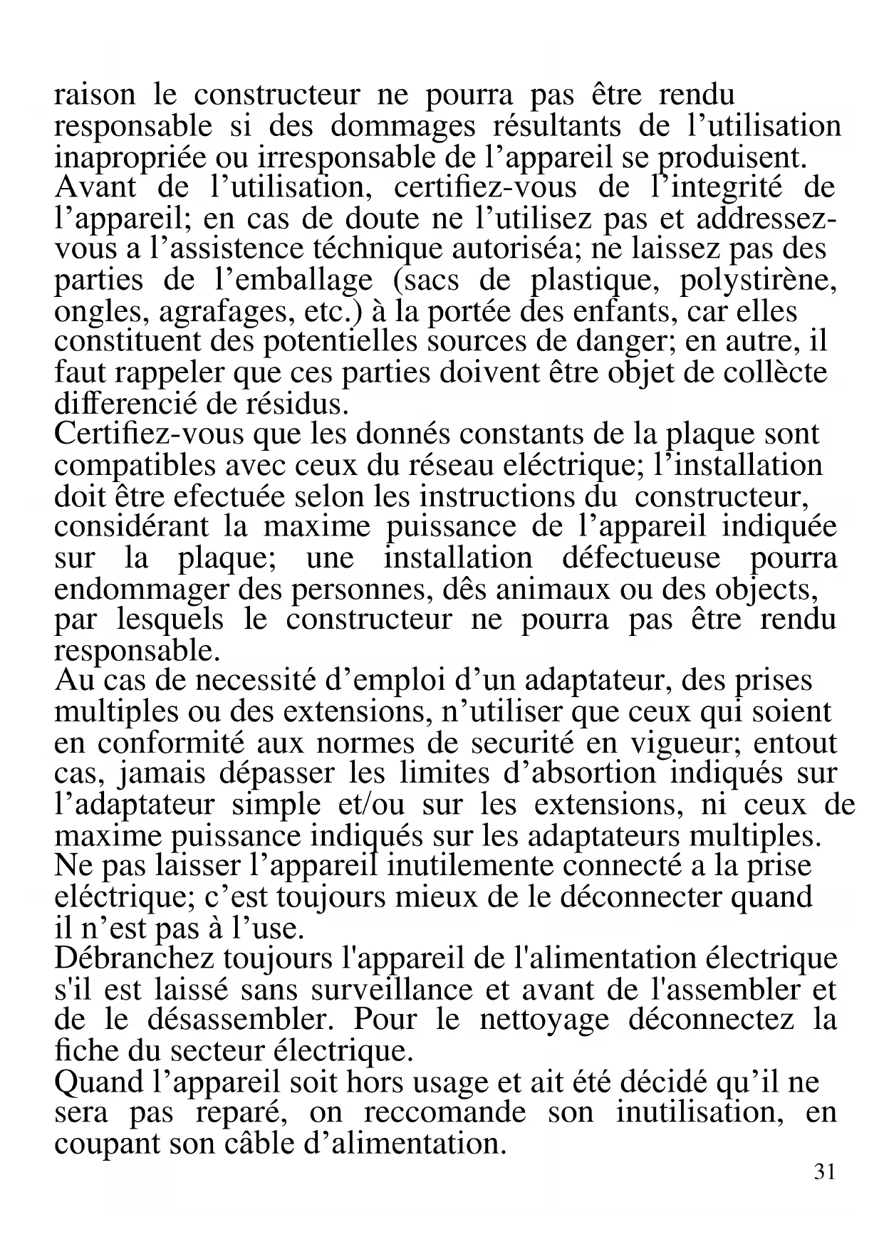 FRANCAIS: ADVERTISSEMENT Les indications suivantes sont très importantes en ce qui concerne l’installation, usage et manutention de cet appareil; gardez soigneusement ce manuel pour des futures consultations; n’utilisez pas l’appareil que selon les indications de ce manuel d’instructions; n’importe quel autre type d’ utilisation devra être consideré inaproprié et potentiellement dangereux; pour cette31 raison le constructeur ne pourra pas être rendu responsable si des dommages résultants de l’utilisation inapropriée ou irresponsable de l’appareil se produisent. Avant de l’utilisation, certifiez-vous de l’integrité de l’appareil; en cas de doute ne l’utilisez pas et addressez- vous a l’assistence téchnique autoriséa; ne laissez pas des parties de l’emballage (sacs de plastique, polystirène, ongles, agrafages, etc.) à la portée des enfants, car elles constituent des potentielles sources de danger; en autre, il faut rappeler que ces parties doivent être objet de collècte differencié de résidus. Certifiez-vous que les donnés constants de la plaque sont compatibles avec ceux du réseau eléctrique; l’installation doit être efectuée selon les instructions du constructeur, considérant la maxime puissance de l’appareil indiquée sur la plaque; une installation défectueuse pourra endommager des personnes, dês animaux ou des objects, par lesquels le constructeur ne pourra pas être rendu responsable. Au cas de necessité d’emploi d’un adaptateur, des prises multiples ou des extensions, n’utiliser que ceux qui soient en conformité aux normes de securité en vigueur; entout cas, jamais dépasser les limites d’absortion indiqués sur l’adaptateur simple et/ou sur les extensions, ni ceux de maxime puissance indiqués sur les adaptateurs multiples. Ne pas laisser l’appareil inutilemente connecté a la prise eléctrique; c’est toujours mieux de le déconnecter quand il n’est pas à l’use. Débranchez toujours l'appareil de l'alimentation électrique s'il est laissé sans surveillance et avant de l'assembler et de le désassembler. Pour le nettoyage déconnectez la fiche du secteur électrique. Quand l’appareil soit hors usage et ait été décidé qu’il ne sera pas reparé, on reccomande son inutilisation, en coupant son câble d’alimentation.32 - Ne pas approcher le câble d’alimentation d’objects coupants ou de surfaces chaudes, et ne pas tirer sur le cordon d’alimentation pour le débrancher de la prise. Ne le laissez pas pendre du plan de travail où un enfant pourrait le tenir. - Ne pas utiliser l’appareil si le câble d’alimentation ou la fiche de connéction eléctrique sont endommagés, ou encore en cas de court-circuits; dans ce cas là, apporter l’appareil a un centre d’assistence autorisé. - L’appareil n’est pas indiqué pour être exposé à des conditions météorologiques défavorables (pluie, vent, humidité, la glace, etc.); Gardez-le dans un endroit sec. Jamais opérer ou même toucher l’appareil avec les mains mouillées ou les pieds nus. - Cet appareil peut être utilisé par des enfants agés de plus de 8 ans et par des personnes avec une réduite capacité phisique, sensorial ou mental, ou encore avec peu d’expérience à son usage, pourvu qu’une supervision adéquate leur en soit assuré, ou s’ils auraient été instruits à l’usage de l’appareil en complete securité. Les opérations de nettoyage e de manutention ne oivent pás être efectués par des enfants, sauf pour ceux qui sont agés de plus de 8 ans et sont supervisionés. - Les enfants ne doivent pas jouer avec cet appareil. - Gardez l’appareil et le câble d’alimentation hors la portée des enfants agés de moins de 8 ans. - L’appareil est pour l’usage domestique et intérieur. Au cas de panne et/ou de mauvais fonctionnement, ne pas intervenir sur l’ appareil. Pour une éventuel réparation s’addresser uniquement a un centre autorisé par le constructeur, en demandant dês pièces de remplacement originaux. Le non respect de ces indications peut compromettre la securité de l’appareil e rendre invalides les termes de la garantie. ATTENTION: Cet appareil comporte une fonction de33 chauffage. Quelques surfaces, même si non la plaque elle même, pourront atteindre des températures élevées. Étant donné que la sensibilité à la température diffère de personne à personne, cet appareil devrà être usé avec PRUDENCE. Placez l’appareil sur des surfaces adéhrentes et préparées pour cet effet, et utilisez les mésures de protection contre la chaleur conseillées, comme dês poignées ou des gants de cuisine. - Cet appareil est destiné à être utilisé dans les ménages et des applications similaires: les cuisines du personnel dans les magasins, bureaux et autres environnements de travail, pour les clients dans les hôtels, motels et autres environnements de type résidentiel, de type lit et petit- déjeuner, hébergement. - L’appareil n’est pas conçu pour être utilisé avec une minuterie extérieure ou un commande à distance. - N’utiliser que des accéssoires e pièces d’origine. Avant chaque utilisation, effectuez le cordon d'alimentation. Ne soumettez pas le produit à des chocs susceptibles de l'endommager.