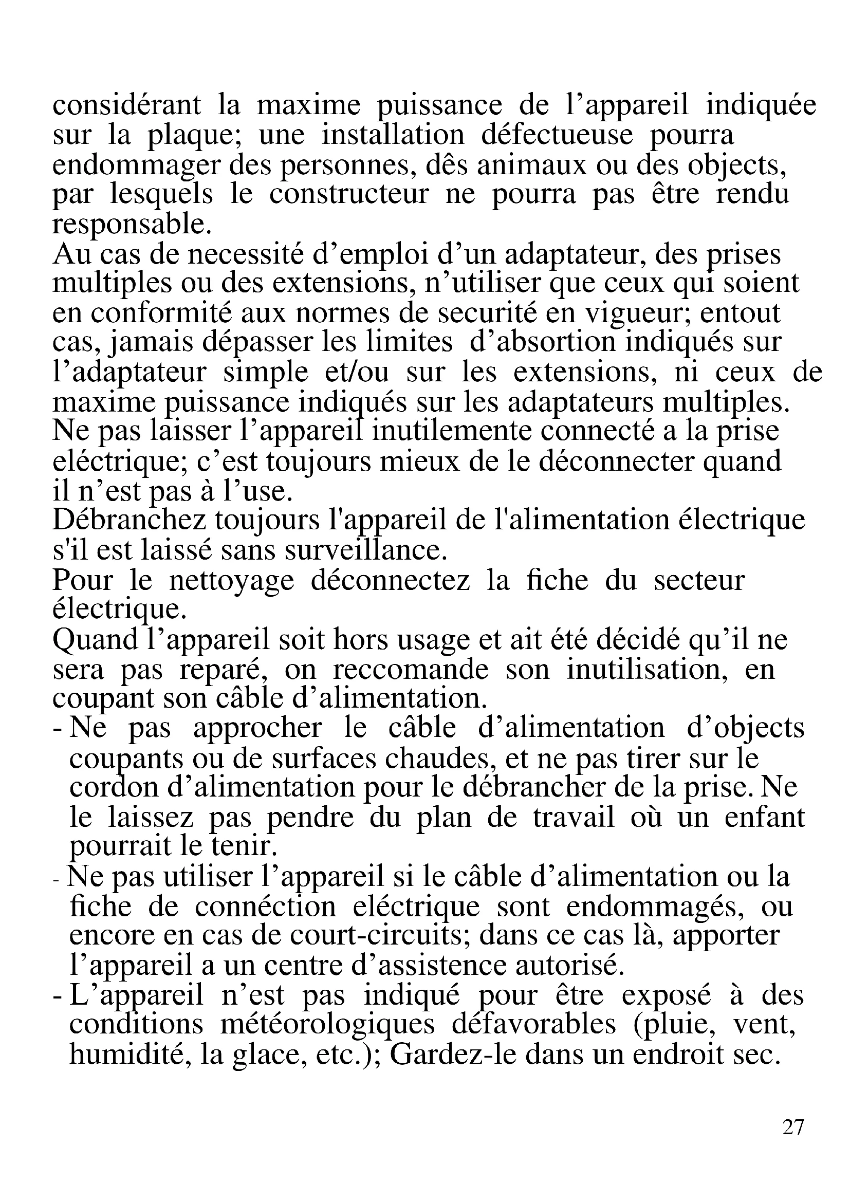 FRANCAIS: ADVERTISSEMENT Les indications suivantes sont très importantes en ce qui concerne l’installation, usage et manutention de cet appareil; gardez soigneusement ce manuel pour des futures consultations; n’utilisez pas l’appareil que selon les indications de ce manuel d’instructions; n’importe quel autre type d’ utilisation devra être consideré inaproprié et potentiellement dangereux; pour cette raison le constructeur ne pourra pas être rendu responsable si des dommages résultants de l’utilisation inapropriée ou irresponsable de l’appareil se produisent. Avant de l’utilisation, certifiez-vous de l’integrité de l’appareil; en cas de doute ne l’utilisez pas et addressez- vous a l’assistence téchnique autoriséa; ne laissez pas des parties de l’emballage (sacs de plastique, polystirène, ongles, agrafages, etc.) à la portée des enfants, car elles constituent des potentielles sources de danger; en autre, il faut rappeler que ces parties doivent être objet de collècte differencié de résidus. Certifiez-vous que les donnés constants de la plaque sont compatibles avec ceux du réseau eléctrique; l’installation doit être efectuée selon les instructions du constructeur,27 considérant la maxime puissance de l’appareil indiquée sur la plaque; une installation défectueuse pourra endommager des personnes, dês animaux ou des objects, par lesquels le constructeur ne pourra pas être rendu responsable. Au cas de necessité d’emploi d’un adaptateur, des prises multiples ou des extensions, n’utiliser que ceux qui soient en conformité aux normes de securité en vigueur; entout cas, jamais dépasser les limites d’absortion indiqués sur l’adaptateur simple et/ou sur les extensions, ni ceux de maxime puissance indiqués sur les adaptateurs multiples. Ne pas laisser l’appareil inutilemente connecté a la prise eléctrique; c’est toujours mieux de le déconnecter quand il n’est pas à l’use. Débranchez toujours l'appareil de l'alimentation électrique s'il est laissé sans surveillance. Pour le nettoyage déconnectez la fiche du secteur électrique. Quand l’appareil soit hors usage et ait été décidé qu’il ne sera pas reparé, on reccomande son inutilisation, en coupant son câble d’alimentation. - Ne pas approcher le câble d’alimentation d’objects coupants ou de surfaces chaudes, et ne pas tirer sur le cordon d’alimentation pour le débrancher de la prise. Ne le laissez pas pendre du plan de travail où un enfant pourrait le tenir. - Ne pas utiliser l’appareil si le câble d’alimentation ou la fiche de connéction eléctrique sont endommagés, ou encore en cas de court-circuits; dans ce cas là, apporter l’appareil a un centre d’assistence autorisé. - L’appareil n’est pas indiqué pour être exposé à des conditions météorologiques défavorables (pluie, vent, humidité, la glace, etc.); Gardez-le dans un endroit sec.28 Jamais opérer ou même toucher l’appareil avec les mains mouillées ou les pieds nus. - Cet appareil peut être utilisé par des enfants agés de plus de 8 ans et par des personnes avec une réduite capacité phisique, sensorial ou mental, ou encore avec peu d’expérience à son usage, pourvu qu’une supervision adéquate leur en soit assuré, ou s’ils auraient été instruits à l’usage de l’appareil en complete securité. Les opérations de nettoyage e de manutention ne oivent pás être efectués par des enfants, sauf pour ceux qui sont agés de plus de 8 ans et sont supervisionés. - Les enfants ne doivent pas jouer avec cet appareil. - Gardez l’appareil et le câble d’alimentation hors la portée des enfants agés de moins de 8 ans. Si le câble d'alimentation est endommagé ou en cas de panne et / ou de dysfonctionnement, ne modifiez pas l'appareil. Toute réparation doit être effectuée par le fabricant ou par son service d'assistance technique ou, en tout cas, par une personne possédant une qualification similaire, afin d'éviter tout risque. Le non-respect de ce qui précède peut compromettre la sécurité de l'appareil et invalider les conditions de la garantie. ATTENTION: Cet appareil comporte une fonction de chauffage. Quelques surfaces, même si non la plaque elle même, pourront atteindre des températures élevées. Étant donné que la sensibilité à la température diffère de personne à personne, cet appareil devrà être usé avec PRUDENCE. Placez l’appareil sur des surfaces adéhrentes et préparées pour cet effet, et utilisez les mésures de protection contre la chaleur conseillées. - Cet appareil est destiné à être utilisé dans les ménages et des applications similaires: les cuisines du personnel dans les magasins, bureaux et autres environnements de travail, pour les clients dans les hôtels, motels et autres29 environnements de type résidentiel, de type lit et petit- déjeuner, hébergement. - L’appareil n’est pas conçu pour être utilisé avec une minuterie extérieure ou un commande à distance. - N’utiliser que des accéssoires e pièces d’origine. Avant chaque utilisation, effectuez le cordon d'alimentation. Ne soumettez pas le produit à des chocs susceptibles de l'endommager. - Tenir l’appareil à l’écart des environnements où il peut y avoir des gaz, vapeurs, des substances inflammables ou explosives.