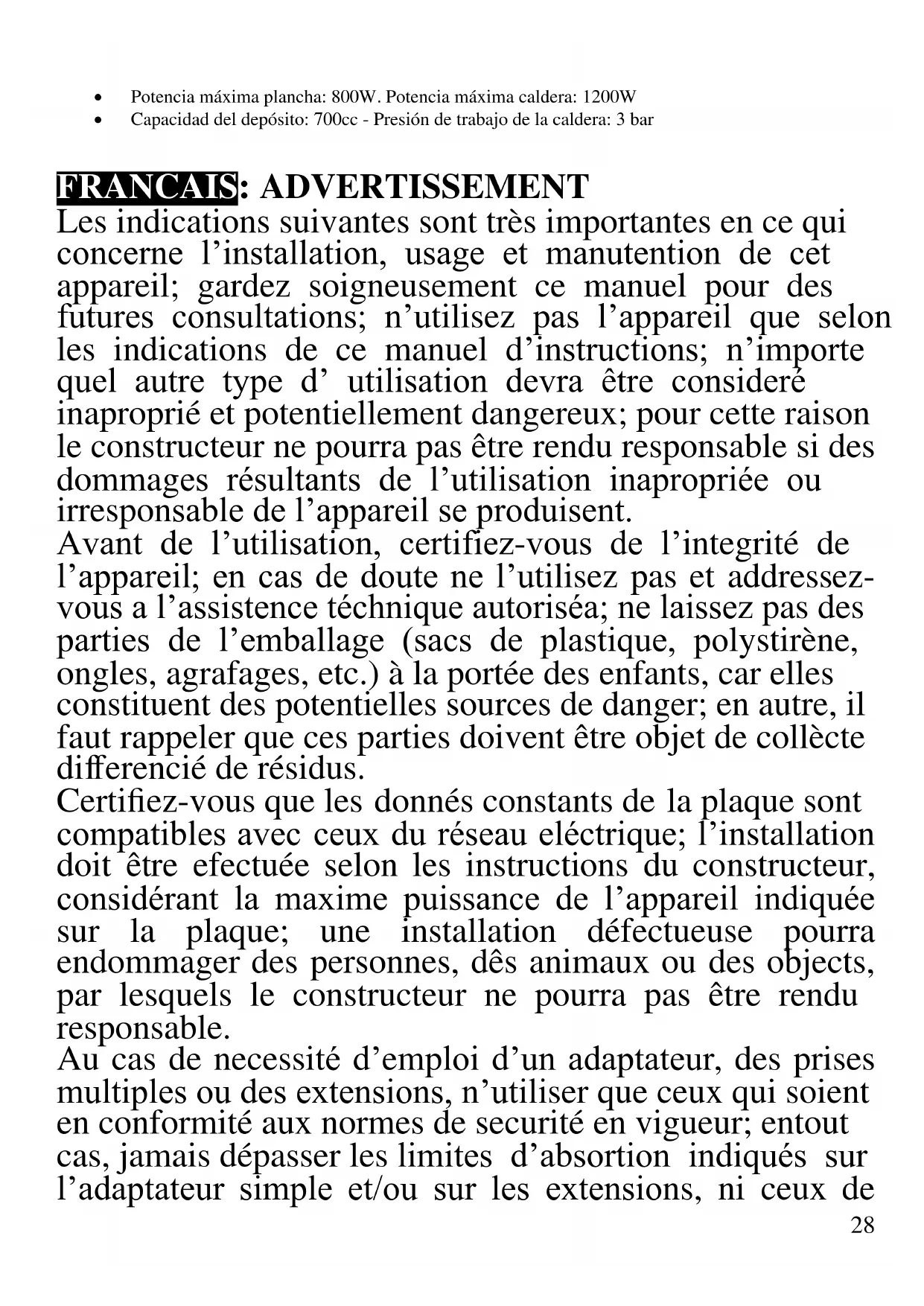 FRANCAIS: ADVERTISSEMENT Les indications suivantes sont très importantes en ce qui concerne l’installation, usage et manutention de cet appareil; gardez soigneusement ce manuel pour des futures consultations; n’utilisez pas l’appareil que selon les indications de ce manuel d’instructions; n’importe quel autre type d’ utilisation devra être consideré inaproprié et potentiellement dangereux; pour cette raison le constructeur ne pourra pas être rendu responsable si des dommages résultants de l’utilisation inapropriée ou irresponsable de l’appareil se produisent. Avant de l’utilisation, certifiez-vous de l’integrité de l’appareil; en cas de doute ne l’utilisez pas et addressez- vous a l’assistence téchnique autoriséa; ne laissez pas des parties de l’emballage (sacs de plastique, polystirène, ongles, agrafages, etc.) à la portée des enfants, car elles constituent des potentielles sources de danger; en autre, il faut rappeler que ces parties doivent être objet de collècte differencié de résidus. Certifiez-vous que les donnés constants de la plaque sont compatibles avec ceux du réseau eléctrique; l’installation doit être efectuée selon les instructions du constructeur, considérant la maxime puissance de l’appareil indiquée sur la plaque; une installation défectueuse pourra endommager des personnes, dês animaux ou des objects, par lesquels le constructeur ne pourra pas être rendu responsable. Au cas de necessité d’emploi d’un adaptateur, des prises multiples ou des extensions, n’utiliser que ceux qui soient en conformité aux normes de securité en vigueur; entout cas, jamais dépasser les limites d’absortion indiqués sur l’adaptateur simple et/ou sur les extensions, ni ceux de29 maxime puissance indiqués sur les adaptateurs multiples. Ne pas laisser l’appareil inutilemente connecté a la prise eléctrique; c’est toujours mieux de le déconnecter quand il n’est pas à l’use. Débranchez toujours l'appareil de l'alimentation électrique s'il est laissé sans surveillance. Pour le nettoyage déconnectez la fiche du secteur électrique. Quand l’appareil soit hors usage et ait été décidé qu’il ne sera pas reparé, on reccomande son inutilisation, en coupant son câble d’alimentation. - Ne pas approcher le câble d’alimentation d’objects coupants ou de surfaces chaudes, et ne pas tirer sur le cordon d’alimentation pour le débrancher de la prise. Ne le laissez pas pendre du plan de travail où un enfant pourrait le tenir. - Ne pas utiliser l’appareil si le câble d’alimentation ou la fiche de connéction eléctrique sont endommagés, ou encore en cas de court-circuits; dans ce cas là, apporter l’appareil a un centre d’assistence autorisé. - L’appareil n’est pas indiqué pour être exposé à des conditions météorologiques défavorables (pluie, vent, humidité, la glace, etc.); Gardez-le dans un endroit sec. Jamais opérer ou même toucher l’appareil avec les mains mouillées ou les pieds nus. - Cet appareil peut être utilisé par des enfants agés de plus de 8 ans et par des personnes avec une réduite capacité phisique, sensorial ou mental, ou encore avec peu d’expérience à son usage, pourvu qu’une supervision adéquate leur en soit assuré, ou s’ils auraient été instruits à l’usage de l’appareil en complete securité. Les opérations de nettoyage e de manutention ne oivent pás être efectués par des enfants, sauf pour ceux qui sont agés de plus de 8 ans et sont supervisionés. - Les enfants ne doivent pas jouer avec cet appareil.30 - Gardez l’appareil et le câble d’alimentation hors la portée des enfants agés de moins de 8 ans. Si le câble d'alimentation est endommagé ou en cas de panne et / ou de dysfonctionnement, ne modifiez pas l'appareil. Toute réparation doit être effectuée par le fabricant ou par son service d'assistance technique ou, en tout cas, par une personne possédant une qualification similaire, afin d'éviter tout risque. Le non-respect de ce qui précède peut compromettre la sécurité de l'appareil et invalider les conditions de la garantie. ATTENTION: Cet appareil comporte une fonction de chauffage. Quelques surfaces, même si non la plaque elle même, pourront atteindre des températures élevées. Étant donné que la sensibilité à la température diffère de personne à personne, cet appareil devrà être usé avec PRUDENCE. Placez l’appareil sur des surfaces adéhrentes et préparées pour cet effet, et utilisez les mésures de protection contre la chaleur conseillées. - Cet appareil est destiné à être utilisé dans les ménages et des applications similaires: les cuisines du personnel dans les magasins, bureaux et autres environnements de travail, pour les clients dans les hôtels, motels et autres environnements de type résidentiel, de type lit et petit- déjeuner, hébergement. - L’appareil n’est pas conçu pour être utilisé avec une minuterie extérieure ou un commande à distance. - N’utiliser que des accéssoires e pièces d’origine. - Avant chaque utilisation, effectuez le cordon d'alimentation. Ne soumettez pas le produit à des chocs susceptibles de l'endommager.