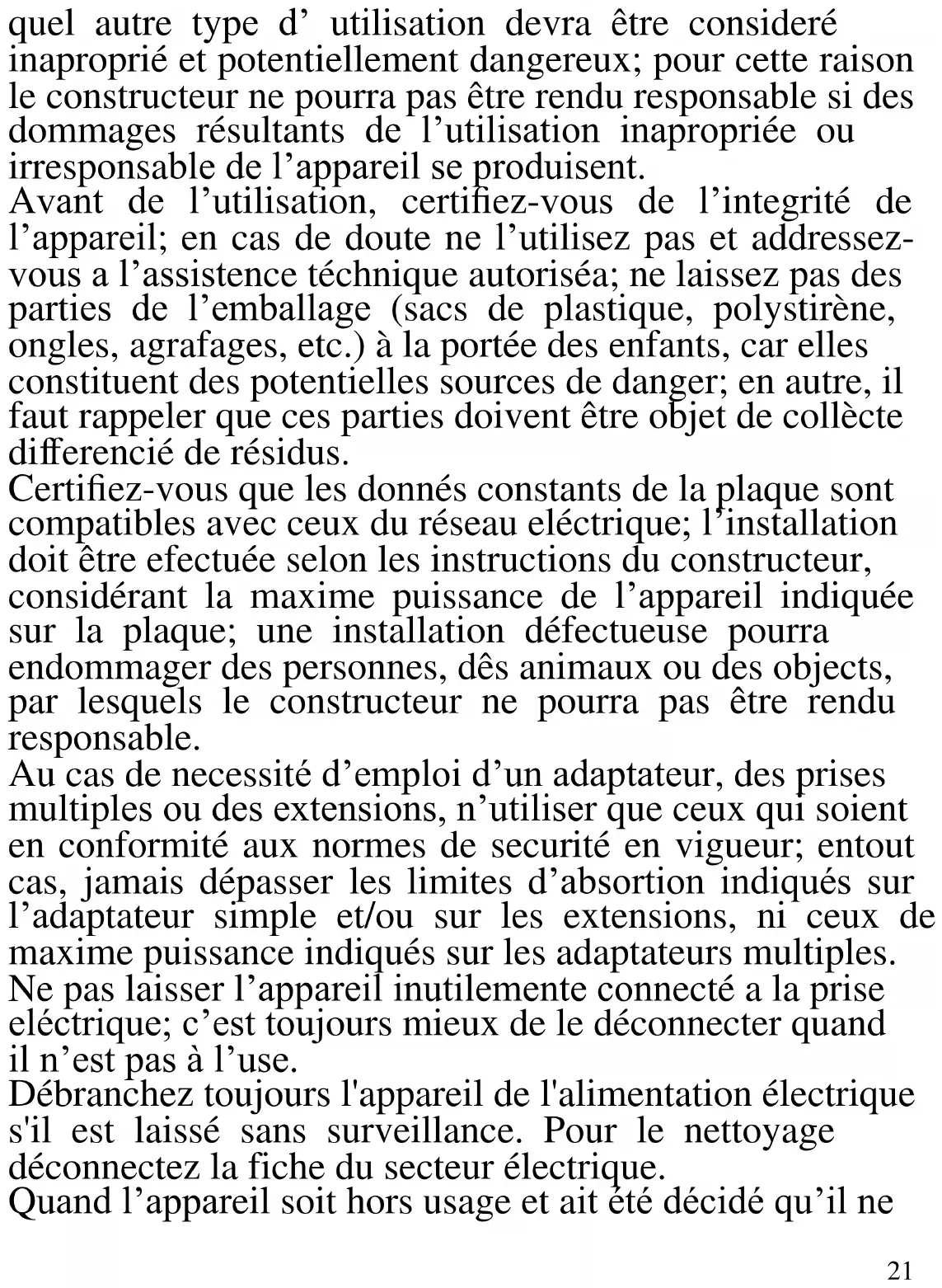 FRANCAIS: ADVERTISSEMENT Les indications suivantes sont très importantes en ce qui concerne l’installation, usage et manutention de cet appareil; gardez soigneusement ce manuel pour des futures consultations; n’utilisez pas l’appareil que selon les indications de ce manuel d’instructions; n’importe21 quel autre type d’ utilisation devra être consideré inaproprié et potentiellement dangereux; pour cette raison le constructeur ne pourra pas être rendu responsable si des dommages résultants de l’utilisation inapropriée ou irresponsable de l’appareil se produisent. Avant de l’utilisation, certifiez-vous de l’integrité de l’appareil; en cas de doute ne l’utilisez pas et addressez- vous a l’assistence téchnique autoriséa; ne laissez pas des parties de l’emballage (sacs de plastique, polystirène, ongles, agrafages, etc.) à la portée des enfants, car elles constituent des potentielles sources de danger; en autre, il faut rappeler que ces parties doivent être objet de collècte differencié de résidus. Certifiez-vous que les donnés constants de la plaque sont compatibles avec ceux du réseau eléctrique; l’installation doit être efectuée selon les instructions du constructeur, considérant la maxime puissance de l’appareil indiquée sur la plaque; une installation défectueuse pourra endommager des personnes, dês animaux ou des objects, par lesquels le constructeur ne pourra pas être rendu responsable. Au cas de necessité d’emploi d’un adaptateur, des prises multiples ou des extensions, n’utiliser que ceux qui soient en conformité aux normes de securité en vigueur; entout cas, jamais dépasser les limites d’absortion indiqués sur l’adaptateur simple et/ou sur les extensions, ni ceux de maxime puissance indiqués sur les adaptateurs multiples. Ne pas laisser l’appareil inutilemente connecté a la prise eléctrique; c’est toujours mieux de le déconnecter quand il n’est pas à l’use. Débranchez toujours l'appareil de l'alimentation électrique s'il est laissé sans surveillance. Pour le nettoyage déconnectez la fiche du secteur électrique. Quand l’appareil soit hors usage et ait été décidé qu’il ne22 sera pas reparé, on reccomande son inutilisation, en coupant son câble d’alimentation. - Ne pas approcher le câble d’alimentation d’objects coupants ou de surfaces chaudes, et ne pas tirer sur le cordon d’alimentation pour le débrancher de la prise. Ne le laissez pas pendre du plan de travail où un enfant pourrait le tenir. - Ne pas utiliser l’appareil si le câble d’alimentation ou la fiche de connéction eléctrique sont endommagés, ou encore en cas de court-circuits; dans ce cas là, apporter l’appareil a un centre d’assistence autorisé. - L’appareil n’est pas indiqué pour être exposé à des conditions météorologiques défavorables (pluie, vent, humidité, la glace, etc.); Gardez-le dans un endroit sec. Jamais opérer ou même toucher l’appareil avec les mains mouillées ou les pieds nus. - Cet appareil peut être utilisé par des enfants agés de plus de 8 ans et par des personnes avec une réduite capacité phisique, sensorial ou mental, ou encore avec peu d’expérience à son usage, pourvu qu’une supervision adéquate leur en soit assuré, ou s’ils auraient été instruits à l’usage de l’appareil en complete securité. Les opérations de nettoyage e de manutention ne oivent pás être efectués par des enfants, sauf pour ceux qui sont agés de plus de 8 ans et sont supervisionés. - Les enfants ne doivent pas jouer avec cet appareil. - Gardez l’appareil et le câble d’alimentation hors la portée des enfants agés de moins de 8 ans. - N’utiliser que des accéssoires e pièces d’origine. Si le câble d'alimentation est endommagé ou en cas de panne et / ou de dysfonctionnement, ne modifiez pas l'appareil. Toute réparation doit être effectuée par le fabricant ou par son service d'assistance technique ou, en tout cas, par une personne possédant une qualification similaire, afin d'éviter tout risque. Le non-respect de ce23 qui précède peut compromettre la sécurité de l'appareil et invalider les conditions de la garantie. ATTENTION: Cet appareil comporte une fonction de chauffage. Quelques surfaces, même si non la plaque elle même, pourront atteindre des températures élevées. Étant donné que la sensibilité à la température diffère de personne à personne, cet appareil devrà être usé avec PRUDENCE. Placez l’appareil sur des surfaces adéhrentes et préparées pour cet effet, et utilisez les mésures de protection contre la chaleur conseillées. - Cet appareil est destiné à être utilisé dans les ménages et des applications similaires: les cuisines du personnel dans les magasins, bureaux et autres environnements de travail, pour les clients dans les hôtels, motels et autres environnements de type résidentiel, de type lit et petit- déjeuner, hébergement. - L’appareil n’est pas conçu pour être utilisé avec une minuterie extérieure ou un commande à distance. - Avant chaque utilisation, effectuez le cordon d'alimentation. Ne soumettez pas le produit à des chocs susceptibles de l'endommager. - Tenir l’appareil à l’écart des environnements où il peut y avoir des gaz, vapeurs, des substances inflammables ou explosives.