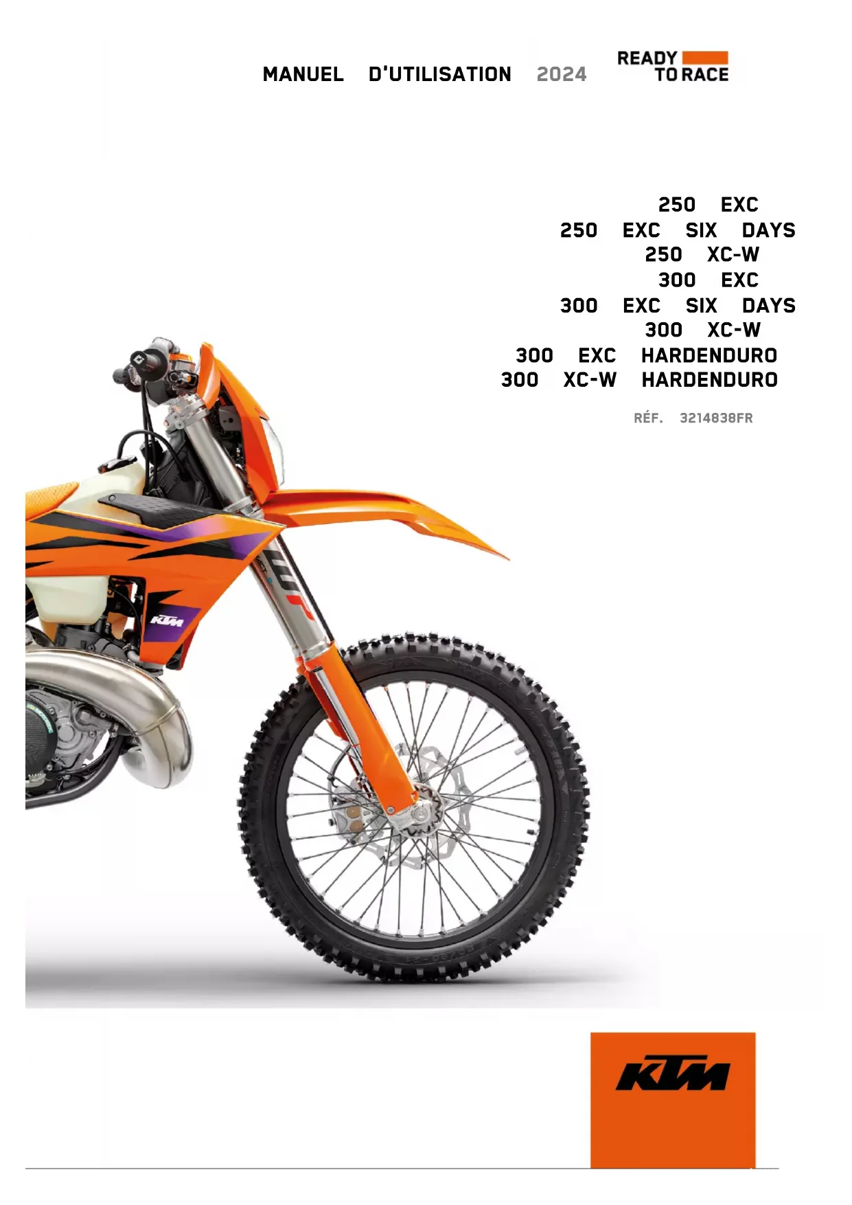 CHER CLIENT KTM, Permettez-nous de vous féliciter sincèrement d'avoir porté votre choix sur une moto KTM. Vous êtes désormais propriétaire d'un véhicule moderne et sportif qui vous satisfera longtemps si vous l'entretenez de façon appro- priée. Nous vous souhaitons de toujours rouler en toute sécurité ! Inscrire ci-dessous les numéros de série du véhicule. Numéro d’identification du véhicule ( p. 15) Cachet du concessionnaire Numéro de moteur ( p. 15) Numéro de clé (tous les modèles EXC) ( p. 15) Le présent manuel d’utilisation correspond à l’état de la série concernée au moment de la publication. Cepen- dant, des divergences minimes résultant de l'évolution technique ne sauraient être exclues. Toutes les informations du présent document sont fournies sans aucun engagement. La société KTM Sportmotor- cycle GmbH se réserve le droit de modifier, de supprimer sans substitution ou d'adapter aux exigences locales les informations techniques, les tarifs, les couleurs, le design, les matériaux, les prestations de services et de main- tenance, les constructions et les équipements ou autres, ainsi que d'arrêter définitivement la fabrication d'un certain modèle sans avis préalable ni indication d'un motif quelconque. KTM décline toute responsabilité en ce qui concerne les possibilités de livraison, les divergences au niveau des croquis et des descriptions, ainsi que les fautes d'impression et les erreurs. Les modèles reproduits dans le présent document sont partiellement pourvus d'équipements spéciaux ne faisant pas partie de l'équipement de série. © 2023 KTM Sportmotorcycle GmbH, Mattighofen Autriche Tous droits réservés Toute reproduction, même partielle, est strictement interdite sans autorisation écrite de l'auteur. ISO 9001(12 100 6061) Conformément à la norme internationale de qualité ISO 9001, KTM utilise des standards d'assu- rance qualité permettant d'obtenir une qualité maximale du produit. Établi par : TÜV Management Service KTM Sportmotorcycle GmbH Stallhofnerstraße 3 5230 Mattighofen, Autriche Ce document est valable pour les modèles suivants : 250 EXC EU (F7303X7) 250 EXC SIX DAYS EU (F7303X2) 250 XC‑W US (F7375X4, F7375X5) 300 EXC EU (F7403X7) 300 EXC BR (F7440X6) 300 EXC SIX DAYS EU (F7403X2) 300 EXC SIX DAYS ASEAN (F7488X2) 300 EXC SIX DAYS BR (F7440X2) 300 EXC SIX DAYS CN (F7487X2) 300 XC‑W US (F7475X3, F7475X4) 300 EXC HARDENDURO EU (F7403X3) 300 EXC HARDENDURO CN (F7487X6) 300 XC‑W HARDENDURO US (F7475X6)SOMMAIRE
