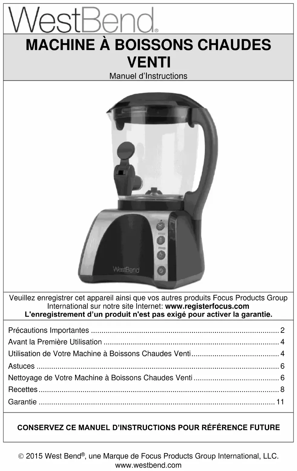Les pièces détachées / de rechange, si disponibles, peuvent être commandées directement à la société de plusieurs façons. En les commandant en ligne sur le lien www.westbend.com, par e-mail au customercare@focuspg.com, par téléphone en appelant au (866)290-1851, ou en écrivant à: Focus Products Group International, LLC. Attn: Customer Care Dept. P. O. Box 53 West Bend, WI 53095 Pour commander à l’aide d’un chèque ou d’un mandat, veuillez commencer par contacter le service d’assistance à la clientèle pour obtenir un total de commande. Envoyez par courrier votre commande, accompagnée d’une lettre mentionnant le modèle et le numéro de catalogue de votre appareil, que vous pourrez trouver en bas ou à l’arrière de l’appareil, une description de la pièce ou des pièces que vous voulez commander, ainsi que la quantité désirée. Votre chèque devra être libellé à l’ordre de Focus Products Group International, LLC. La TVA de votre province et les frais d’envoi, seront ajoutés au montant total. Veuille patienter deux semaines pour que la livraison et le traitement puissent avoir lieu. Ce manuel contient des informations utiles et importantes, sur l’utilisation et l’entretien sécurisés de votre appareil. A titre de référence future, attachez le reçu daté qui vous tiendra lieu de preuve d’achat pour la garantie, et consignez les informations suivantes: Date d’achat ou de réception en cadeau: ___________________________________________ Lieu d’achat et prix, si connus: ___________________________________________________ Numéro de l’article et Code de date (dessous/arrière de l’appareil):______________________ 2015 West Bend